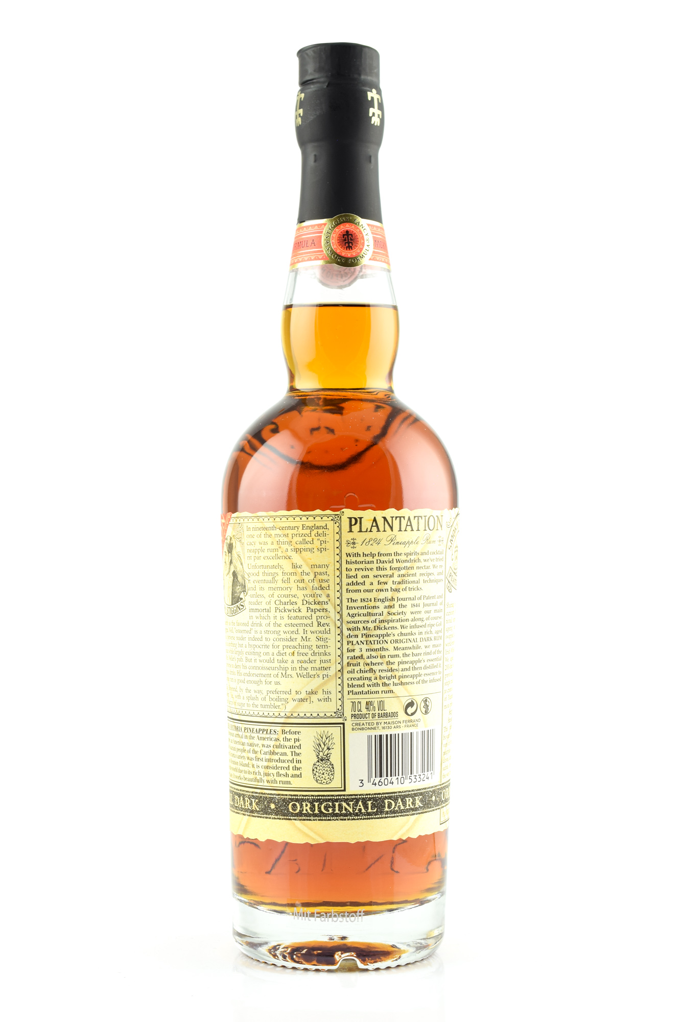 Diese Special Edition wird zunächst auf die gleiche Weise hergestellt wie der originale Pineapple Stiggins' Fancy. Für die Herstellung wird zum einen der Rum PLANTATION Original Dark verwendet. Mit diesem Blend und dem Fruchtfleisch der Ananas wird eine Infusion erstellt. Die Schalen der Ananas werden eingelegt in den weißen Rum PLANTATION 3 Stars. Nach einiger Zeit wird der weiße Rum erneut in den FERRAND Kupfer Pot Stills destilliert.