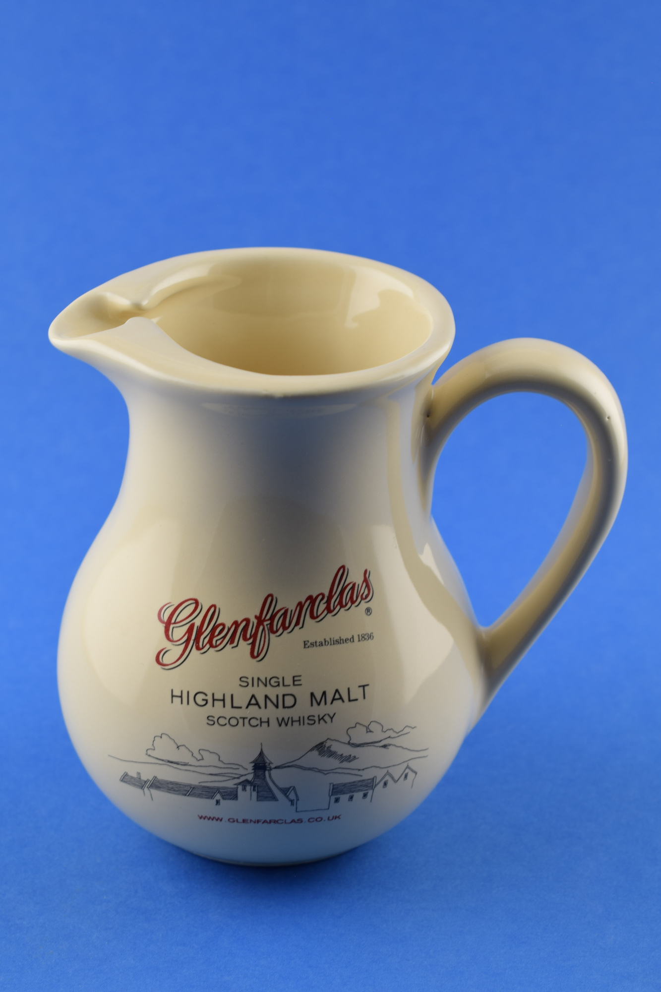 Weißer Wasserkrug aus Keramik mit beidseitigem Aufdruck des Glenfarclas-Logos in rot.