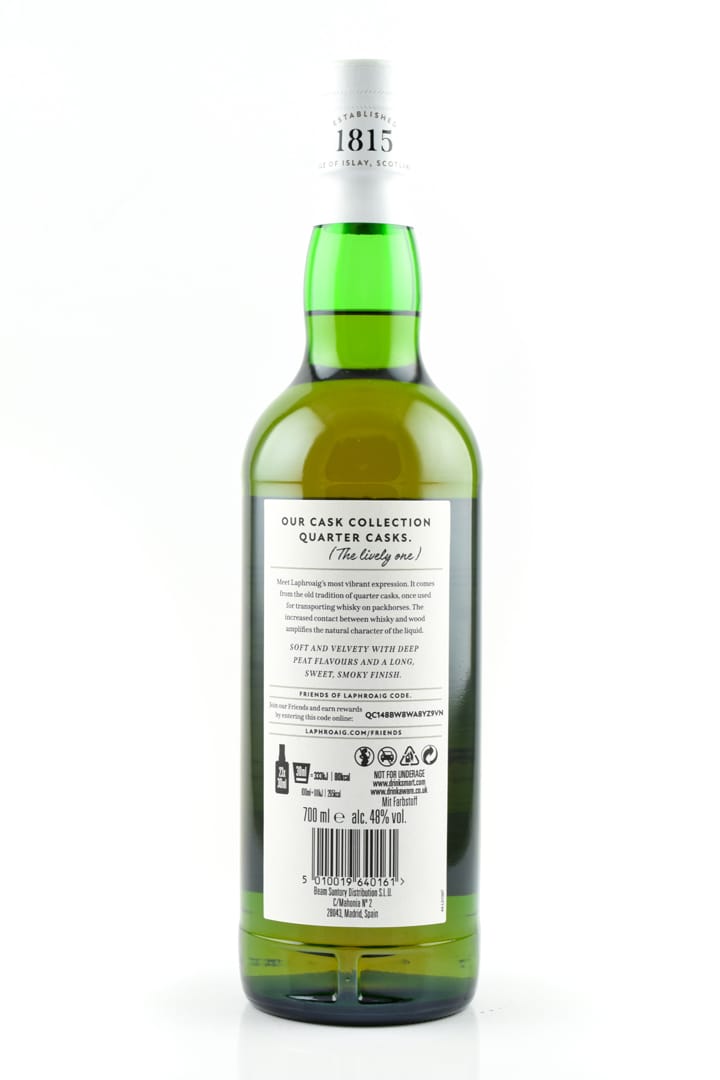Dieser Laphroaig reifte zunächst in exBourbonfässern. Seinen Namen Quarter Cask trägt er aufgrund seiner Nachreifung in recht kleinen Fässern mit einem Volumen von 127 bis 159 Litern, sogenannten Quarter Casks. Durch diese Lagerung des Laphroaig Quarter Cask in Fässern mit einem kleineren Fassungsvermögen wird erreicht, dass der Whisky mehr Kontakt zu der Oberfläche der Fässer aus amerikanischer Weißeiche erhält. Hierdurch werden die Aromen aus dem Fass schneller und stärker übertragen.