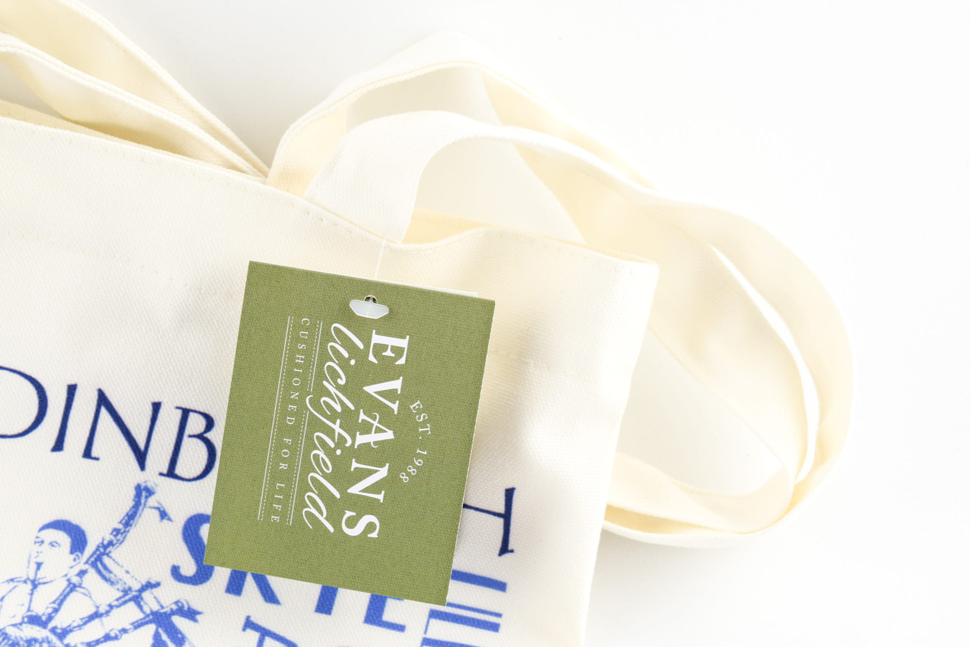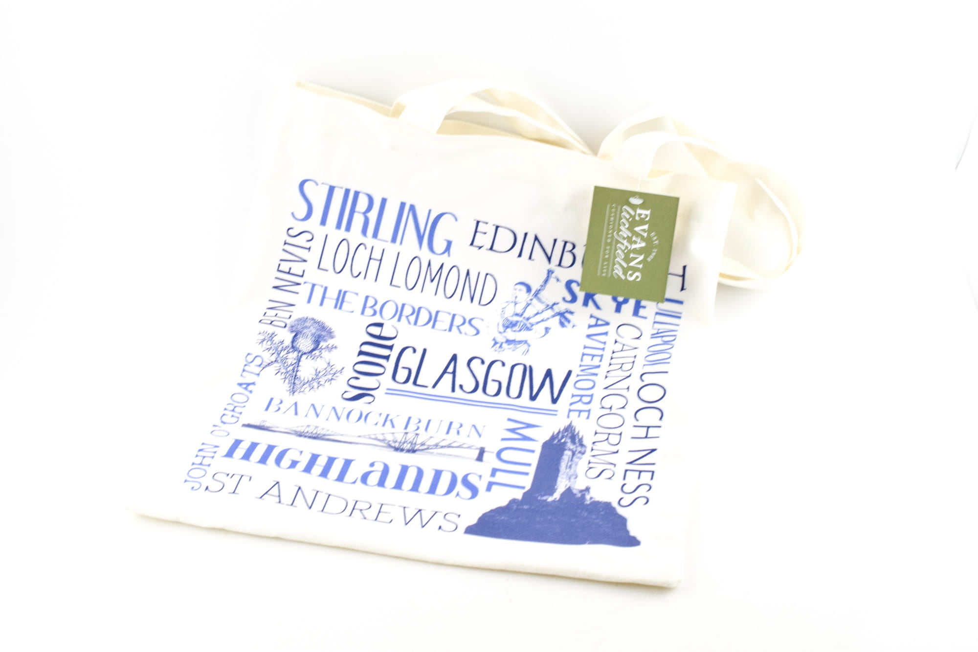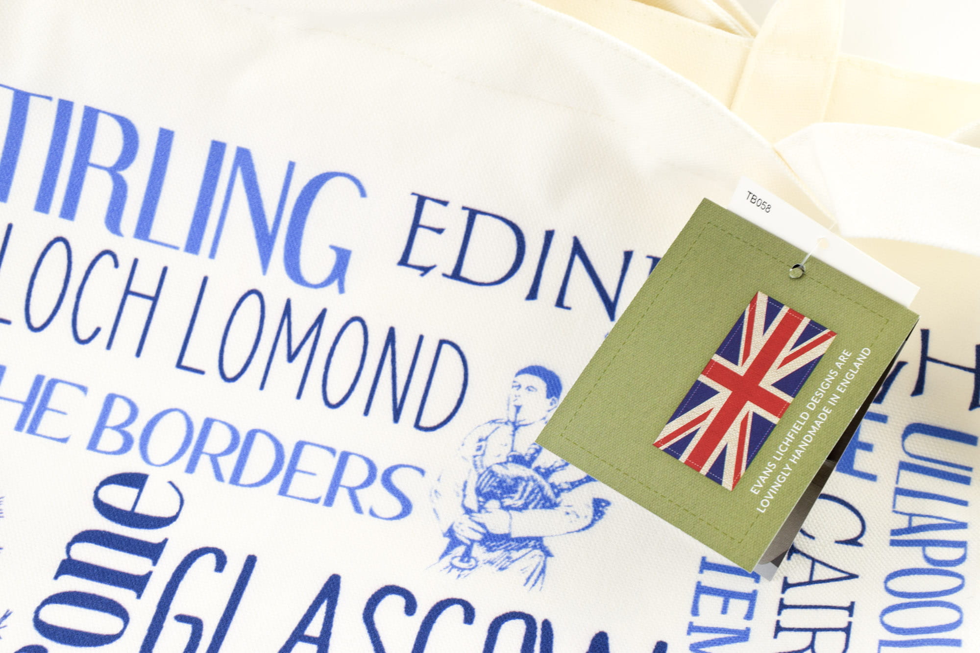 Klassische schottische Motive und Sehenswürdigkeiten, sowie Namen bekannter Straßen und Plätze aus ganz Schottland finden sich auf dieser Tragetasche.
