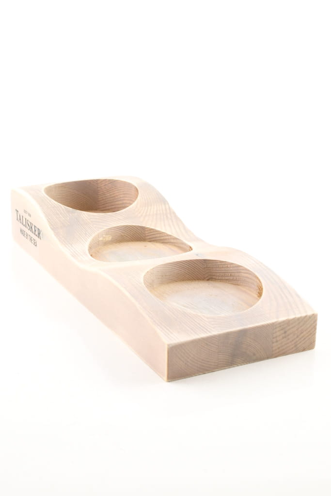 Elegantes Bar-Display aus Holz von der schottischen Destillerie Talisker auf der Insel Skye.