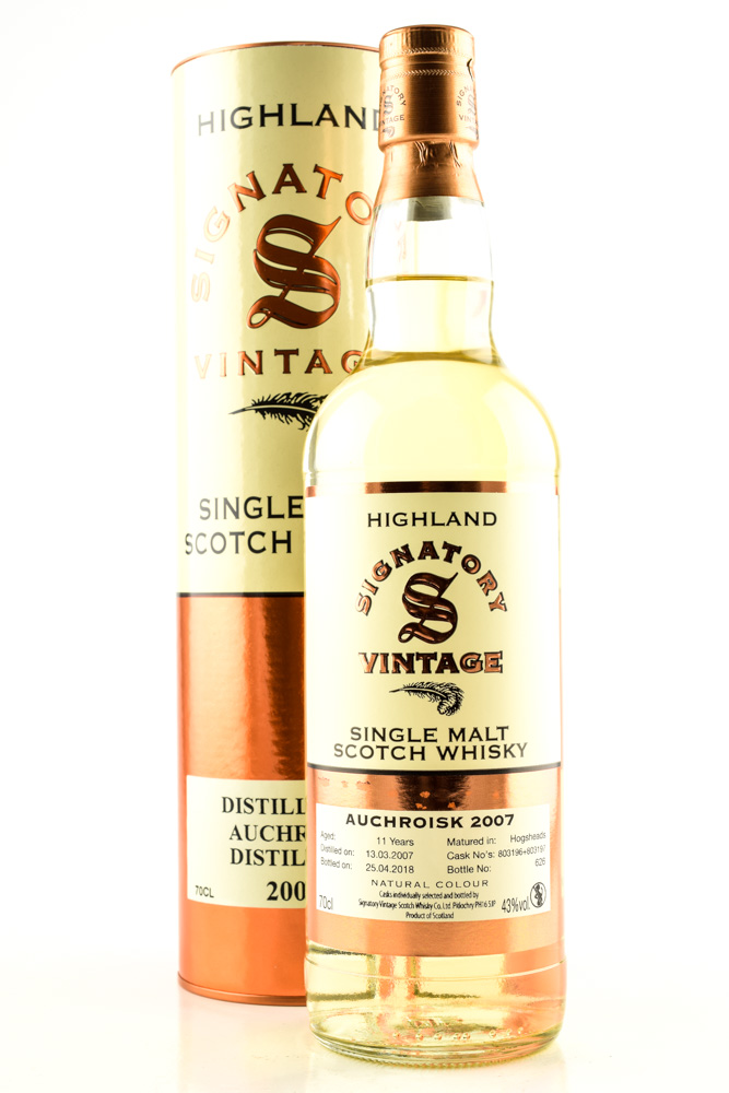 Aus der eher unbekannten Highland-Destillerie Auchroisk stammt dieser 11-jährige Single Malt Whisky, abgefüllt aus zwei Hogsheads, destilliert am 13. März 2007, abgefüllt am 25. April 2018 in Signatorys Vintage-Reihe.