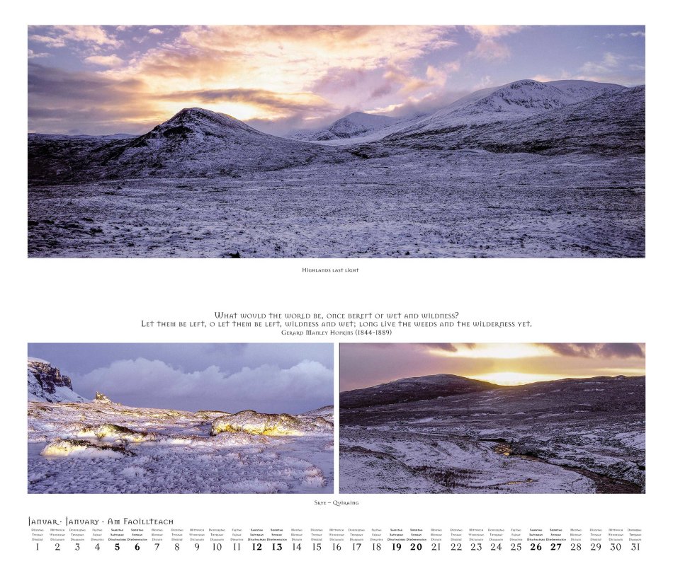 Auch in diesem Jahr ist die Besonderheit dieses Kalenders das dreisprachige Kalendarium und die teilweise zweisprachigem Poems (übernommen von der Canongate Edinburgh) in englisch und gälisch sowie die extrem hohe Bild- und Druckqualität.