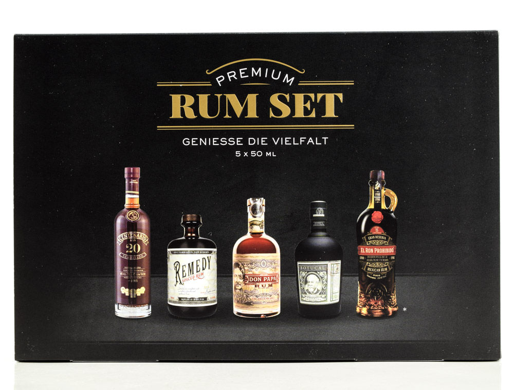 Das Premium Rum-Set beinhaltet fünf Flaschen mit einem Inhalt von je 50ml der exklusiven Rumqualitäten Ron Centenario 20 Jahre, Remedy Spiced, Don Papa Single Island Rum, Botucal Reserva Exclusiva, und El Ron Prohibido 15 Jahre.