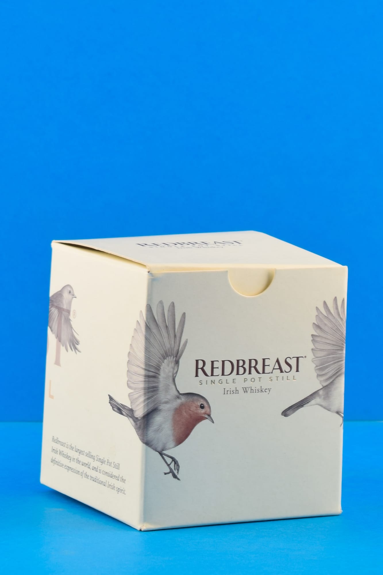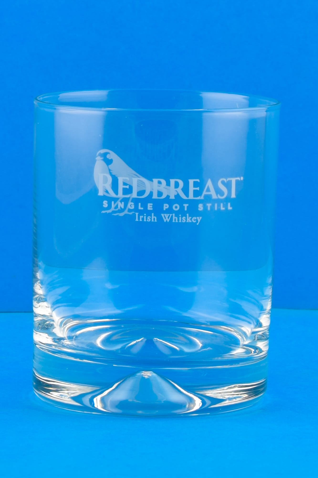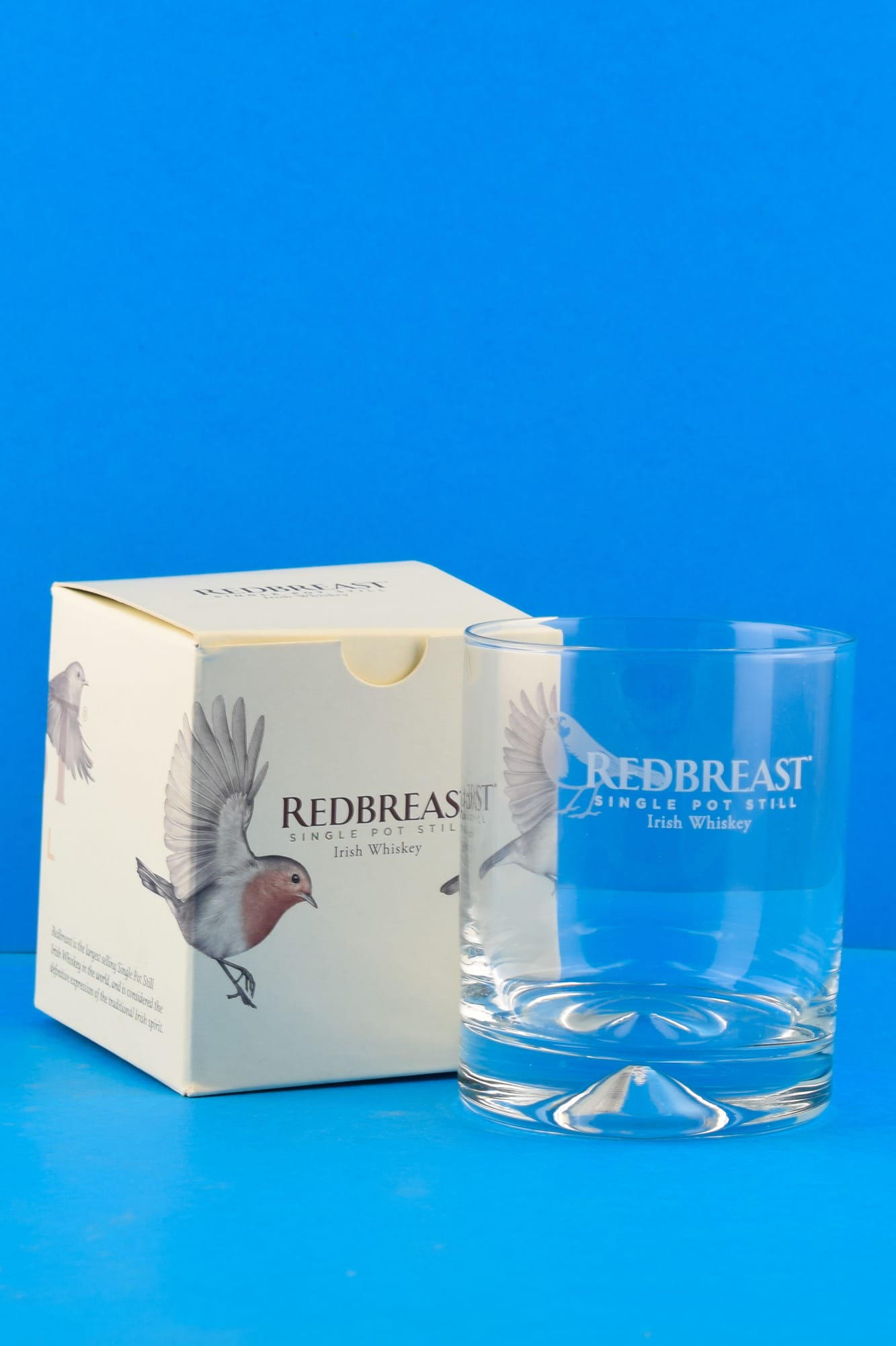 Mit Original-Schriftzug auf der Vorderseite und dem Redbreast-Rotkehlchen auf der Rückseite des Glases setzt der Tumbler auf jedem Tisch (oder in der Hand) ein Zeichen.