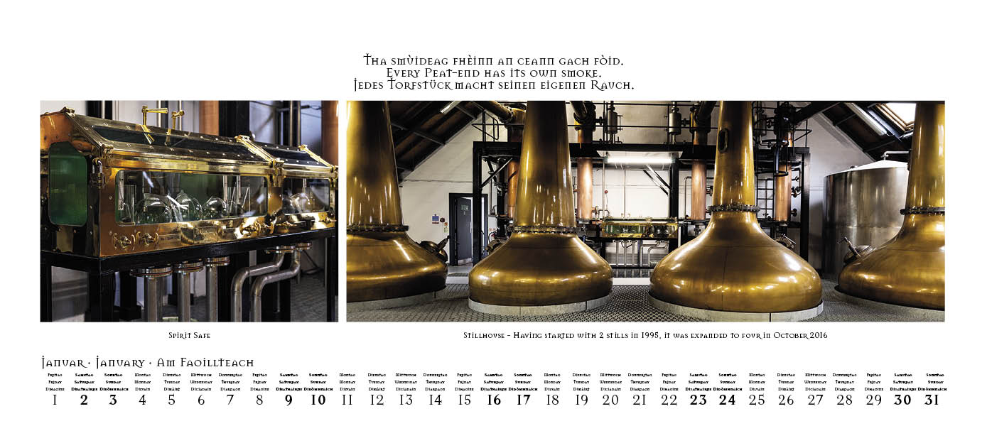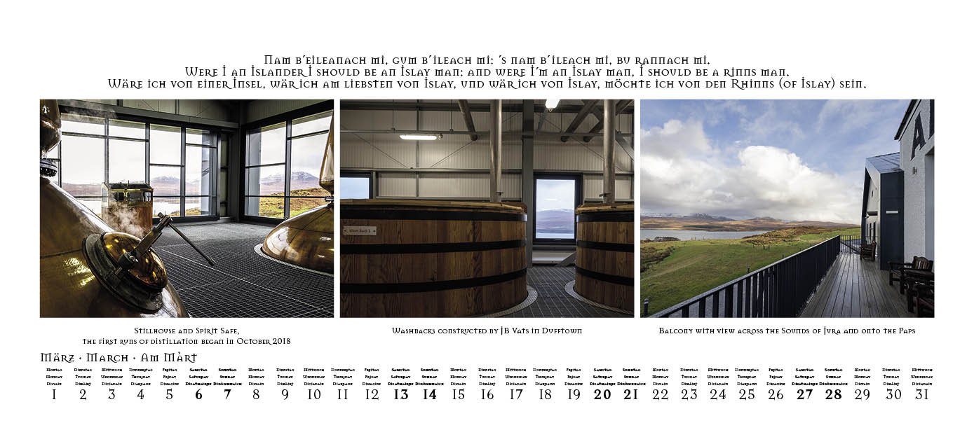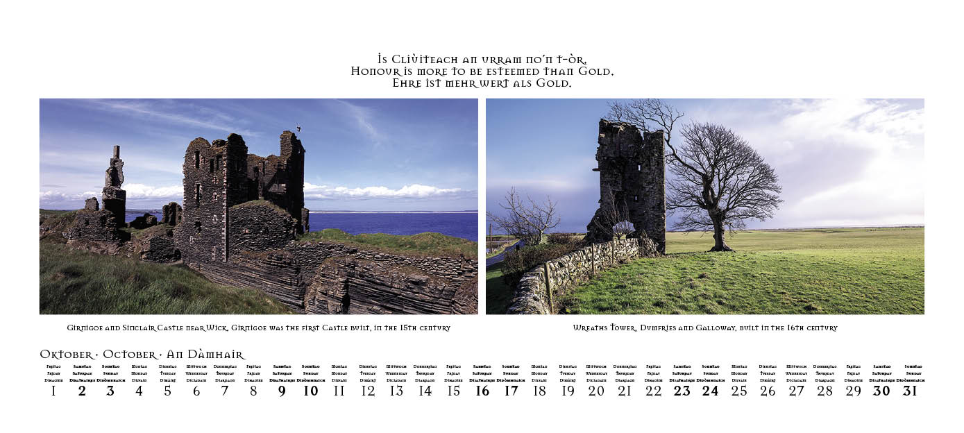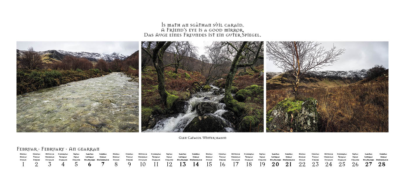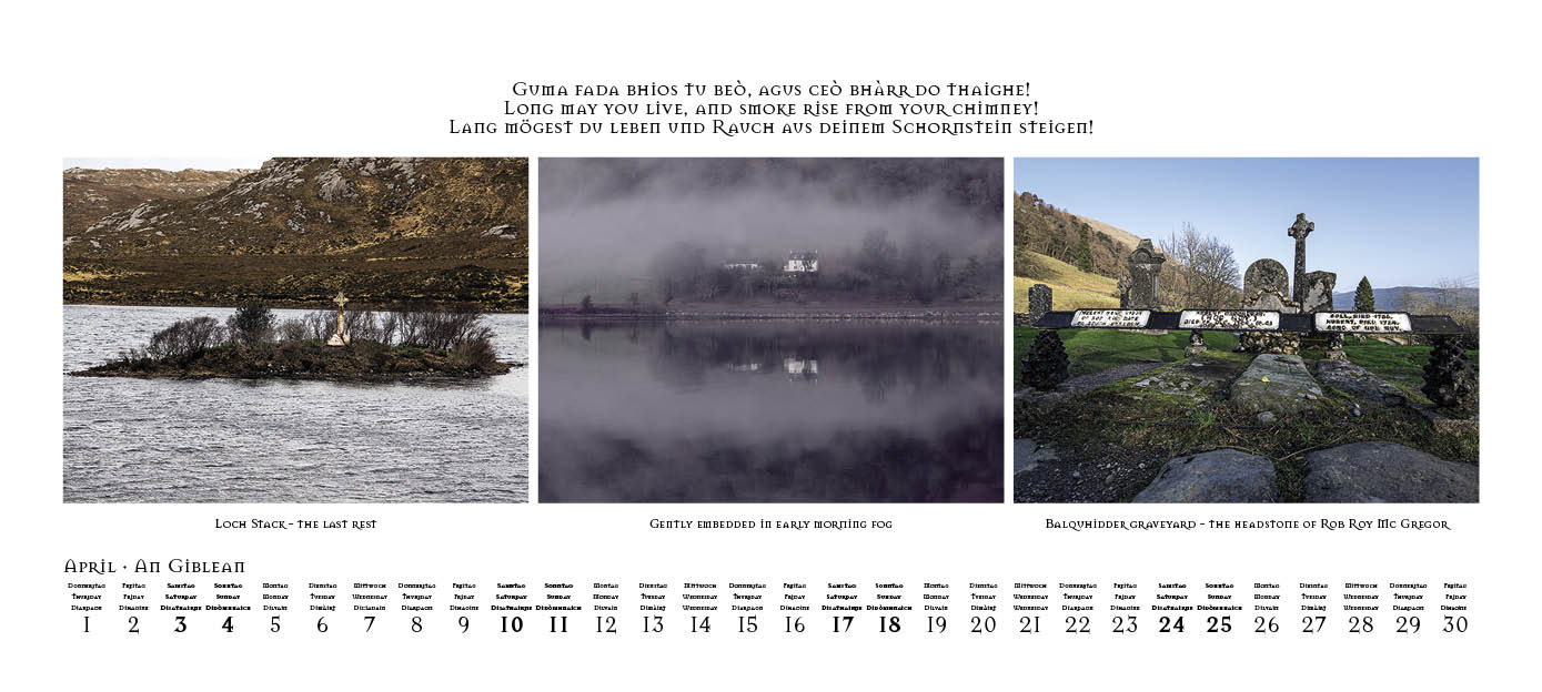 Auch in diesem Jahr ist die Besonderheit dieses Kalenders das dreisprachige Kalendarium und die teilweise zweisprachigem Poems (übernommen von der Canongate Edinburgh) in englisch und gälisch sowie die extrem hohe Bild- und Druckqualität.