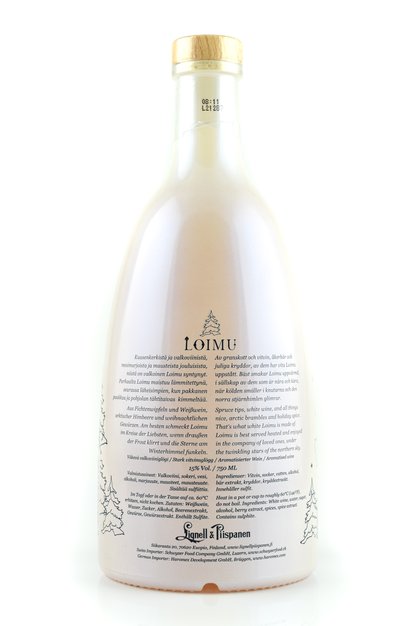 Loimu White, der starke Weisswein Glögg, präsentiert sich in der sehr modernen, typischen Lignell & Piispanen-Designerflasche, abgefüllt mit einem Alkoholgehalt von 15%vol. Ein heiteres "Kippis" (Prost) auf Loimu White in geselliger Runde.