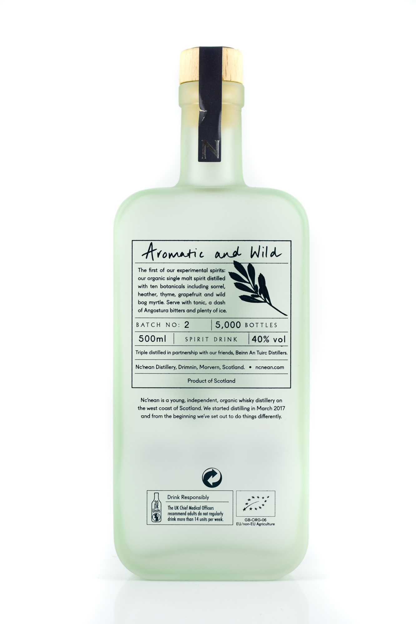 Für die innovative Spirituose im natürlichen Look destillierte Nc'nean in Zusammenarbeit mit der befreundeten, ebenfalls nachhaltig arbeitenden Brennerei Beinn An Tuirc ihren Whisky-Rohbrand ein zweites Mal - unter Zugabe von zehn Botanicals.