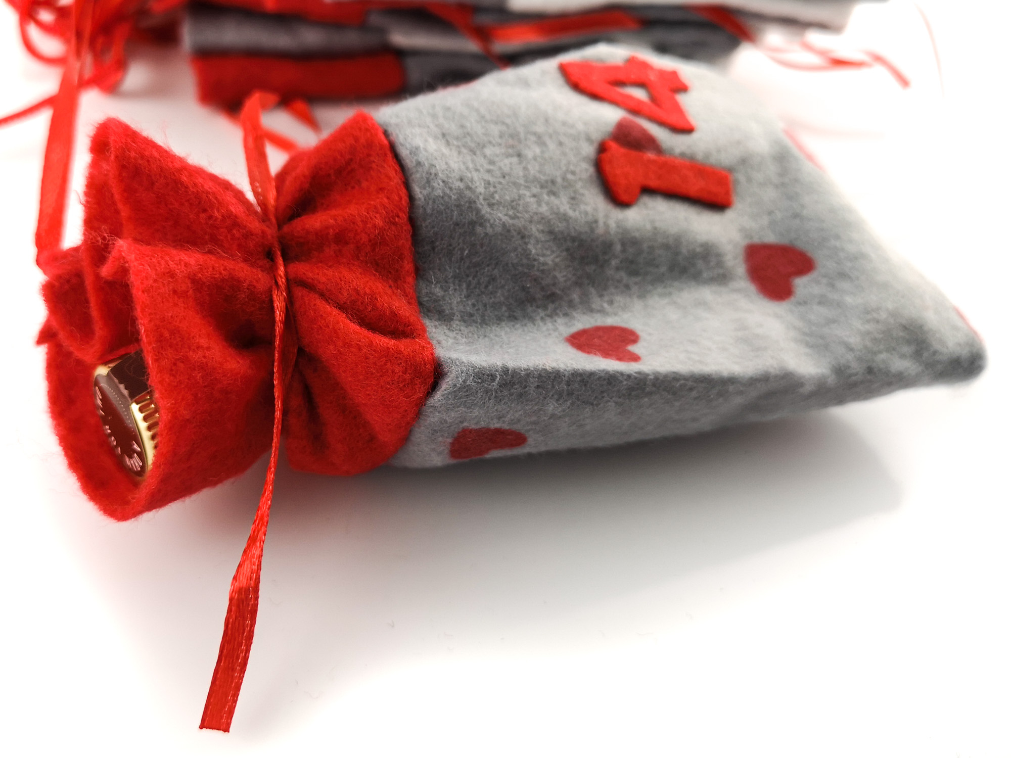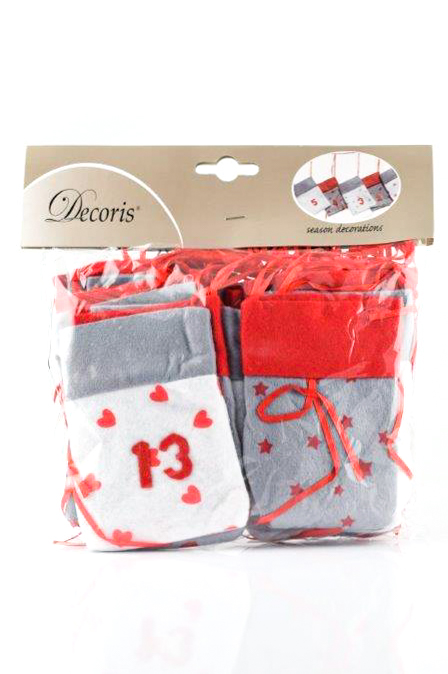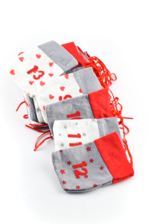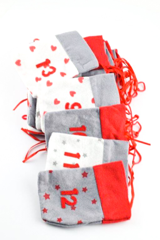 Adventskalendergirlande mit 24 Säckchen aus Filz, Säckchen sind an einer Schnur befestigt, verziert mit Sternen und Herzen, Säckchengröße: 9 x 14 cm, Länge: 1,80 m.