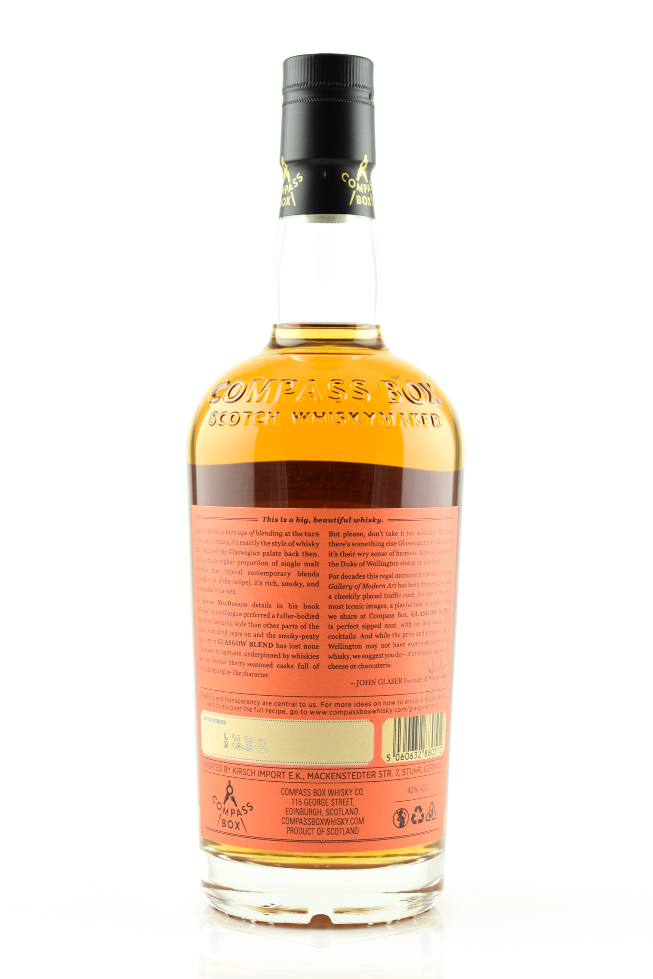 - In Compass Box' Glasgow-Blend findet man eine ausgeprägte torfige Rauchnote, dazu deutliche Sherrynoten, getrocknete Früchte und einen Wein-Charakter, der Geschmack ist voll und rund mit einer Süße von tropischen Früchten
