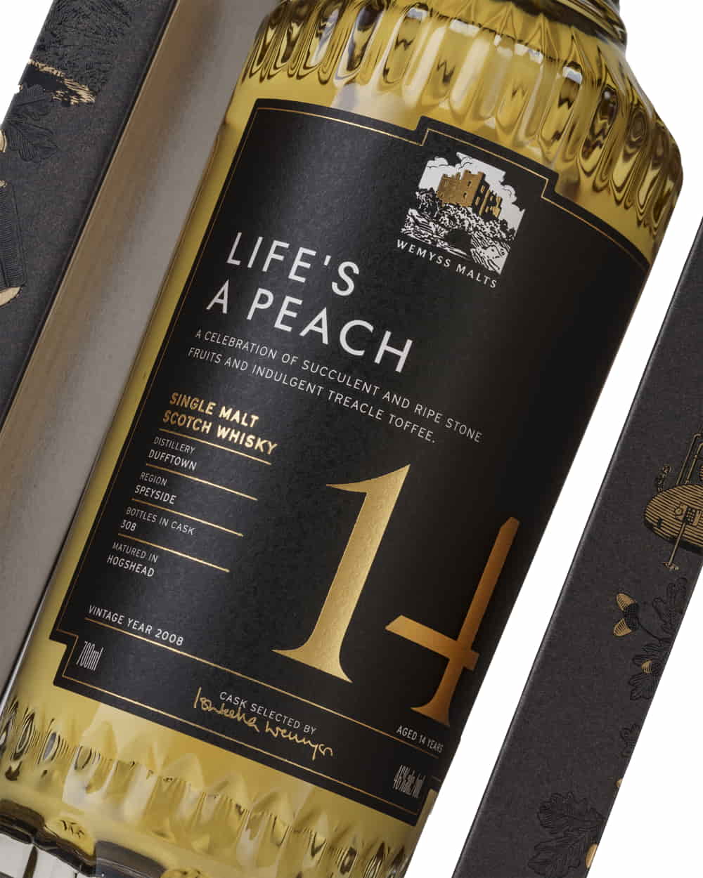 Destilliert im Jahr 2008, reifte der ""Life's a Peach" 14 Jahre 2008 Hogshead Dufftown über 14 Jahre in einem Hogshead, dann füllte Wemyss das Faß im Jahr 2022 auf 308 Flaschen ab.