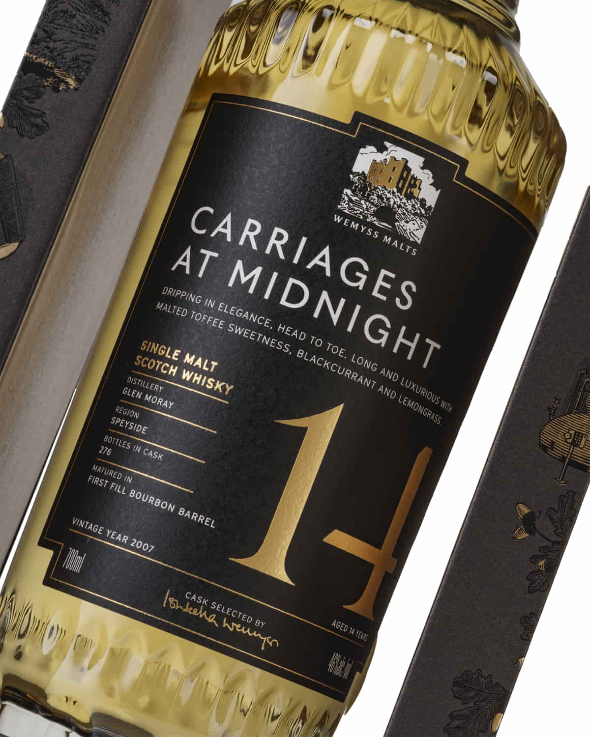 Destilliert im Jahr 2007, reifte der "Carriages at Midnight" 14 Jahre 2007 1st-fill Bourbon Barrel Glen Moray über 14 Jahre, dann füllte Wemyss das Faß im Jahr 2022 auf 276 Flaschen ab.