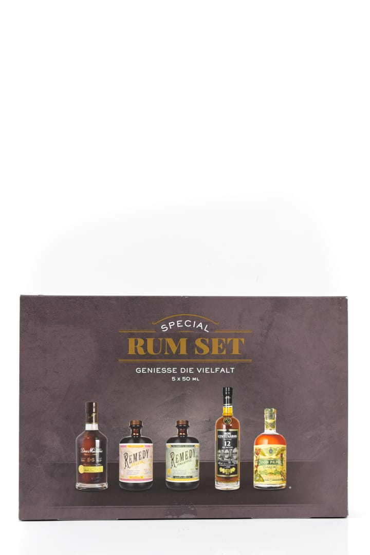 Das Special Rum-Set beinhaltet fünf Flaschen mit einem Inhalt von je 50ml der exklusiven Rumqualitäten von Dos Maderas PX 5+5, Remedy Elixir, Remedy Pineapple, Ron Centenario 12 Jahre und Don Papa Baroko.