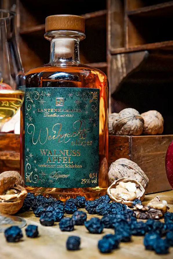 - Die Basis ist ein kräftiger Apfelbrand - verfeinert mit Walnuss und Schlehen
