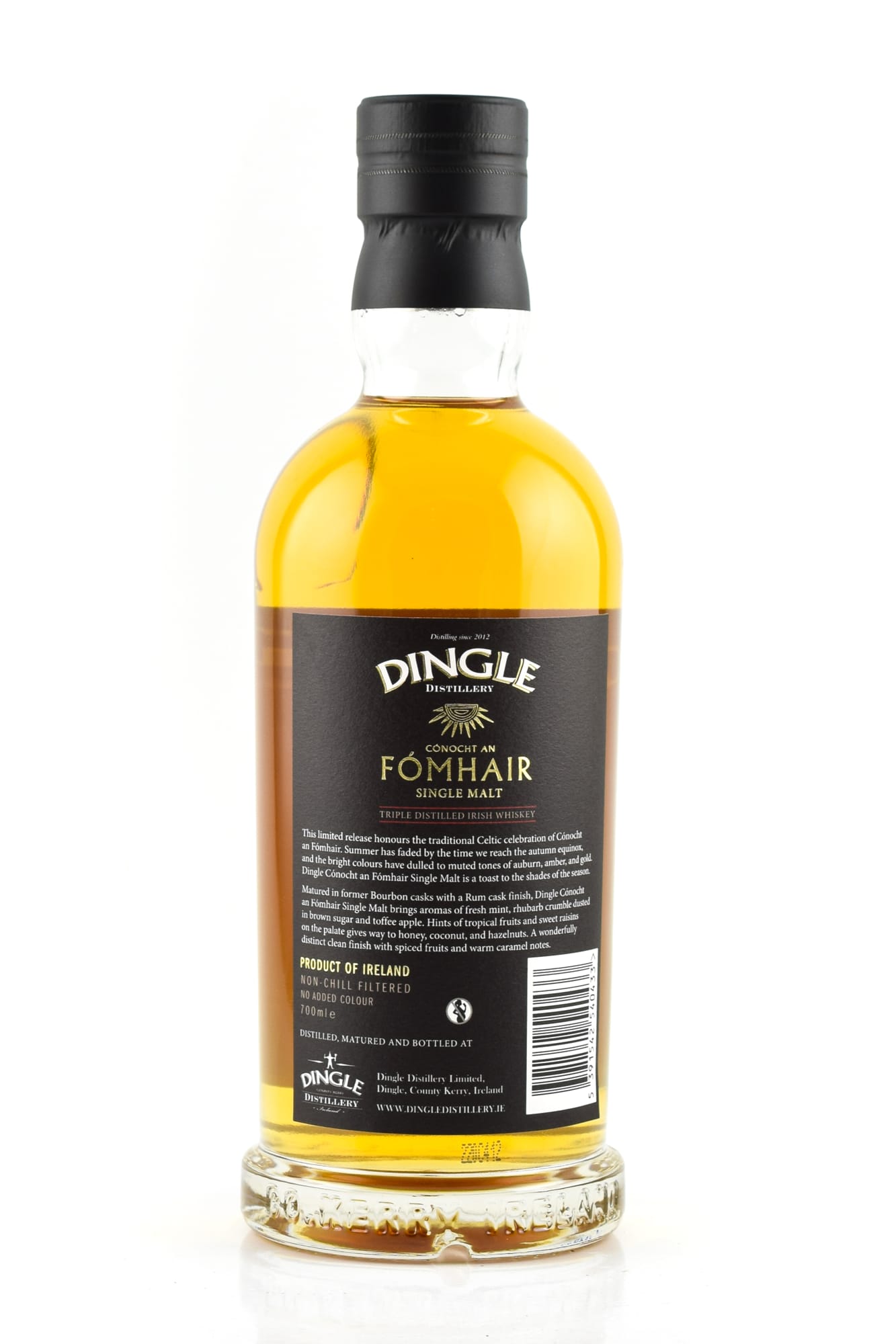 Mit der achten Abfüllung der Serie, dem Cónocht An Fómhair, ehrt Dingle das gleichnamige Fest zur Herbsttagundnachtgleiche. Der goldene Single Malt ist ein Toast auf die farblichen und geschmacklichen Schattierungen der Jahreszeit. In Bourbonfässern gereift und in Rum Casks veredelt, bringt Cónocht An Fómhair Aromen von frischer Minze, Rhabarber-Crumble und kandierten Äpfeln zu Genießern. Ein Hauch von tropischen Früchten und süßen Rosinen weicht Noten von Honig, Kokos und Haselnüssen, bevor das limitierte Erlebnis mit wunderbar ausgeprägten gewürzten Früchten und warmen Karamellnoten ausklingt.