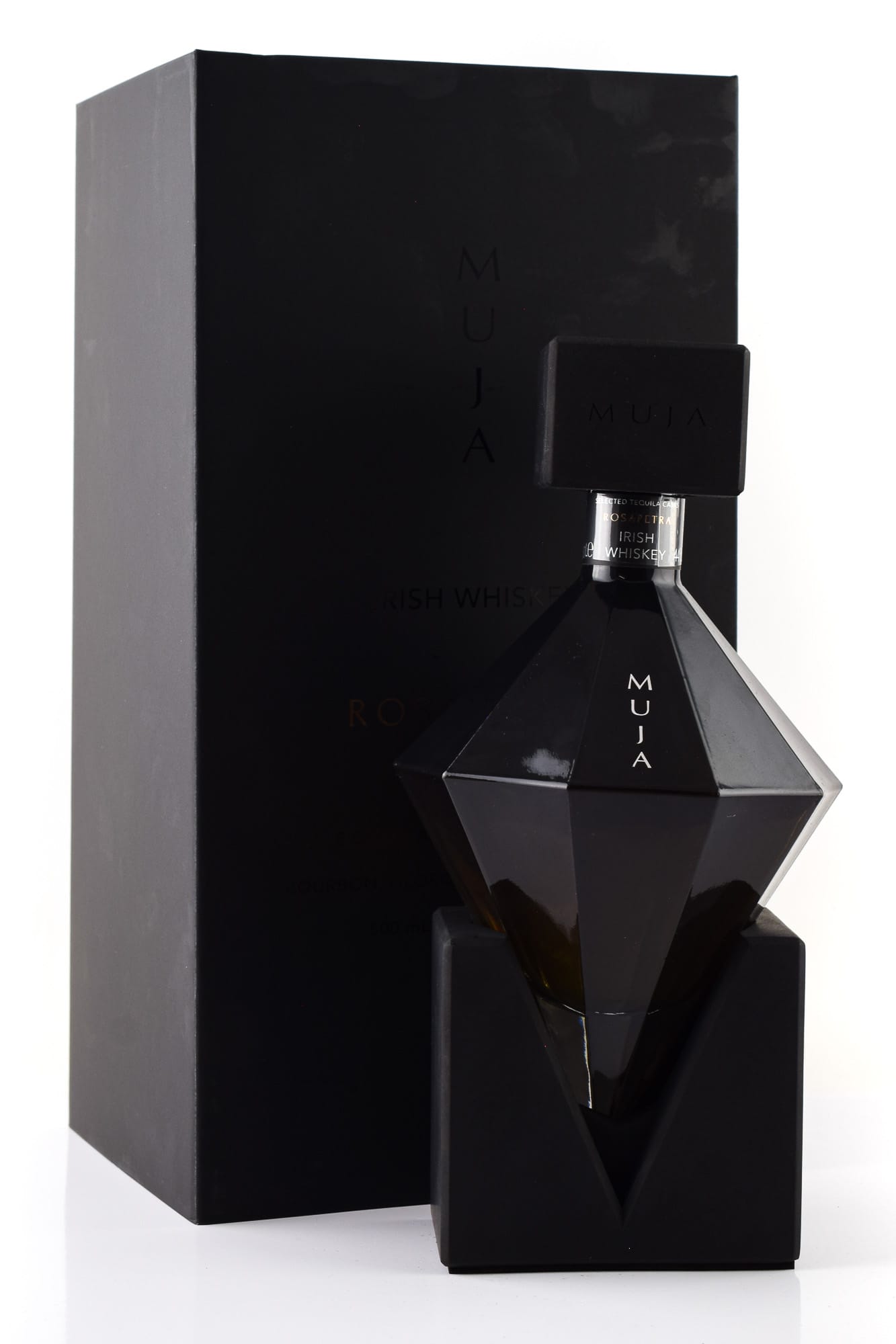 MUJA Rosapetra ist nicht einfach nur ein Irish Whiskey. Er ist eher sowas wie der Designpreis unter den Whiskeys - mit Betonbase, rauchschwarzer Flasche und mehr Ecken und Kanten als ein Architektenkongress. Statt sich in Omas Vitrine zwischen Zinnbecher und Jagdhorn zu verstecken, thront MUJA Rosapetra stolz auf seinem Sockel - in einer diamantförmigen Flasche, die aussieht, als hätte ein Luxus-Parfum und ein moderner Skulpturenpark ein gemeinsames Projekt gestartet.