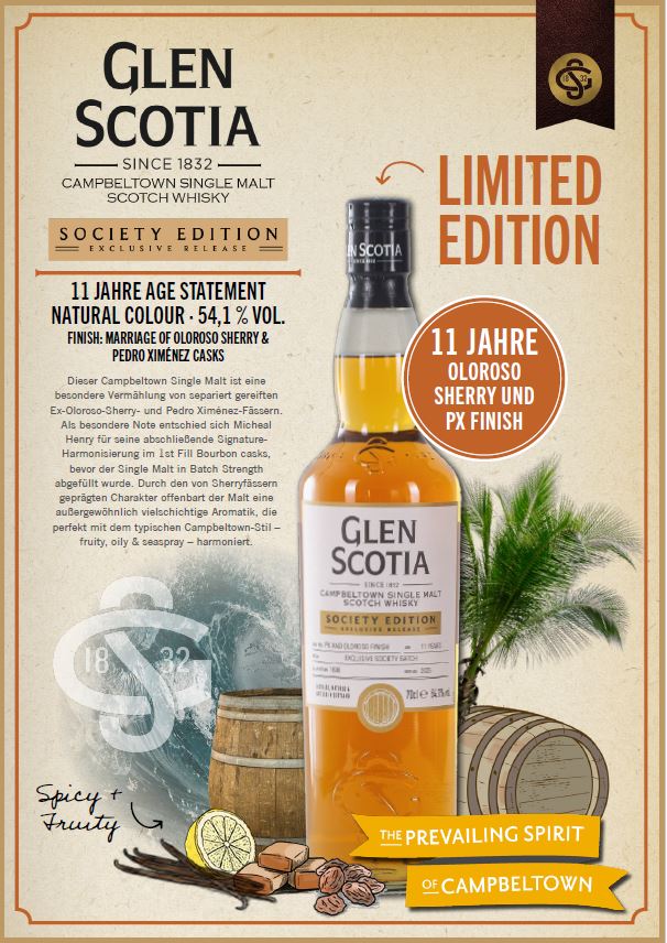 Die Limited Edition ist streng limitiert: nur 1.698 Flaschen für Deutschland - quasi ein VIP-Pass in die Welt des Glen Scotia. Jeder, der eine ergattert, kann sich glücklich schätzen, Teil einer exklusiven Community zu sein: der Glen Scotia Society. Hier trifft maritime Campbeltown-Tradition auf die südspanische Sherry-Kunst - eine Kombination, die man so nicht alle Tage bekommt.