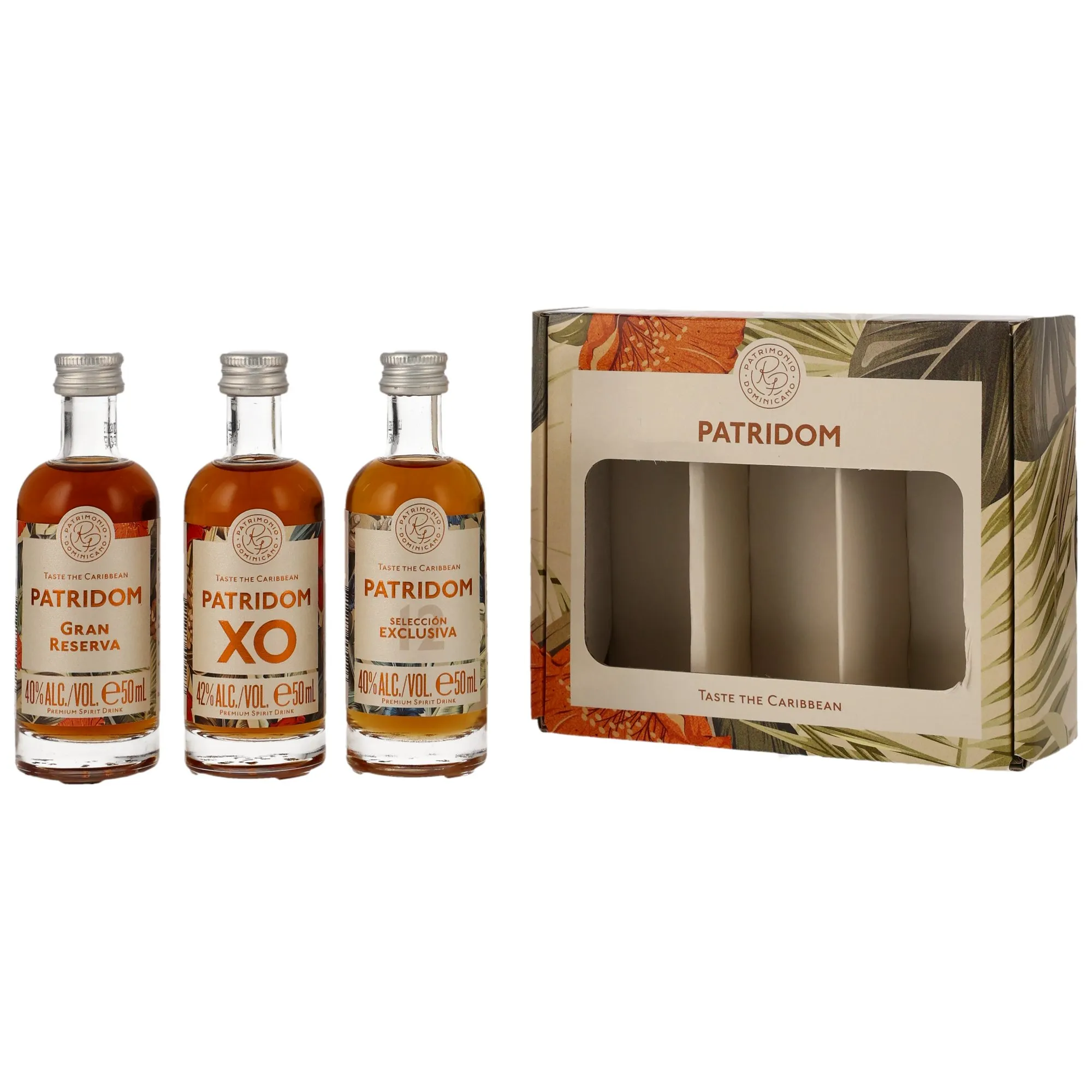 Der Patridom Tasting-Set verkörpert die Seele der Dominikanischen Republik in jeder Flasche. Die sorgfältige Auswahl der Zutaten kombiniert mit traditionellen Destillationsmethoden sorgt für einen Rum, der seinesgleichen sucht. Hier erlebt man das Zusammenspiel von Geschichte und Handwerk in perfekter Harmonie.