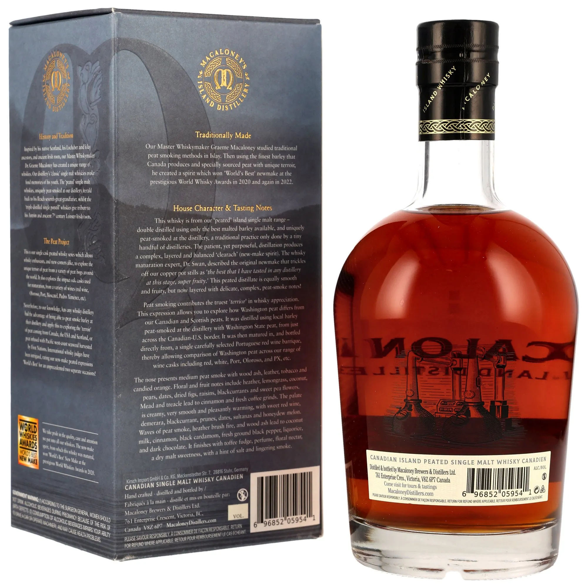 Der Macaloney - Peat Project ist ein herausragendes Beispiel für kanadische Whisky-Kunst. Dieser Single Malt wird in der Macaloney Brewers & Distillers Ltd. destilliert, einem Unternehmen, das Tradition mit Innovation verbindet. Durch die Verwendung von sorgfältig ausgewählten portugiesischen Rotwein-Fässern erhält dieser Whisky nicht nur seine markante Farbe, sondern auch eine bemerkenswerte Geschmacksvielfalt.