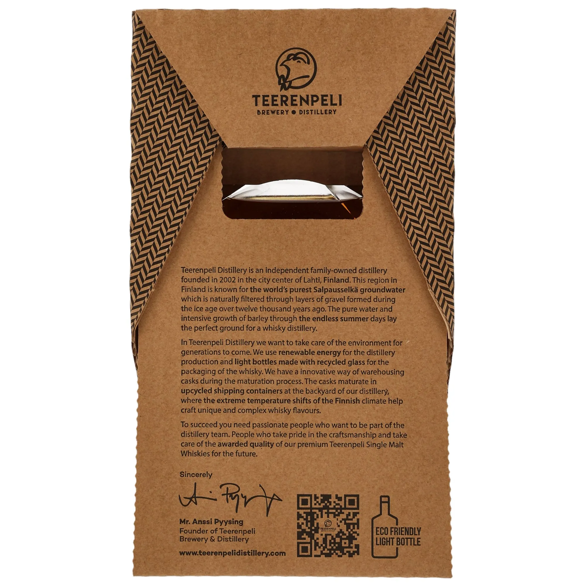 Im Jahr 2002 wurde in Finnlands erster und größter Whiskydestillerie, Teerenpeli, ein einzigartiger Rohbrand kreiert. Die zarten, süßen und oft floralen Whiskys dieser innovativen Brennerei sind in Finnland äußerst beliebt. Jährlich produziert Teerenpeli über 100.000 Liter Alkohol, und das mit einem Fokus auf Nachhaltigkeit – unter Verwendung erneuerbarer Energien.