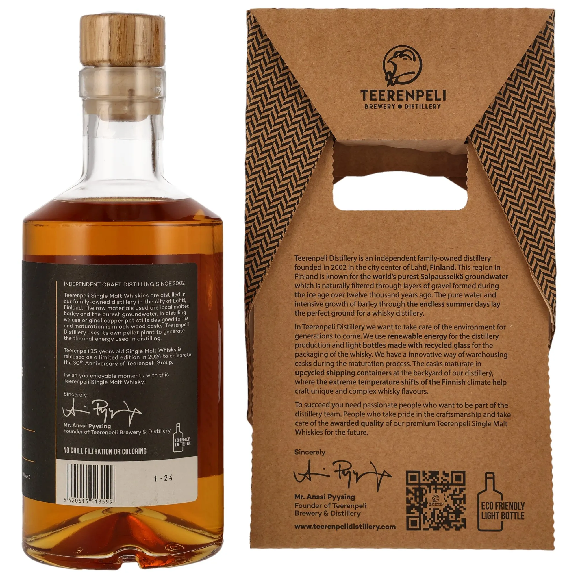 Der Teerenpeli 15 y.o. ist mehr als nur ein Whisky; er ist ein Meilenstein in der Geschichte der Destillerie. Gebrannt aus finnischer Gerste und gereift in einer Kombination aus Bourbon- und Sherryfässern, bietet er ein Geschmacksprofil, das sowohl die Tradition als auch die Pionierarbeit Finnlands verkörpert.