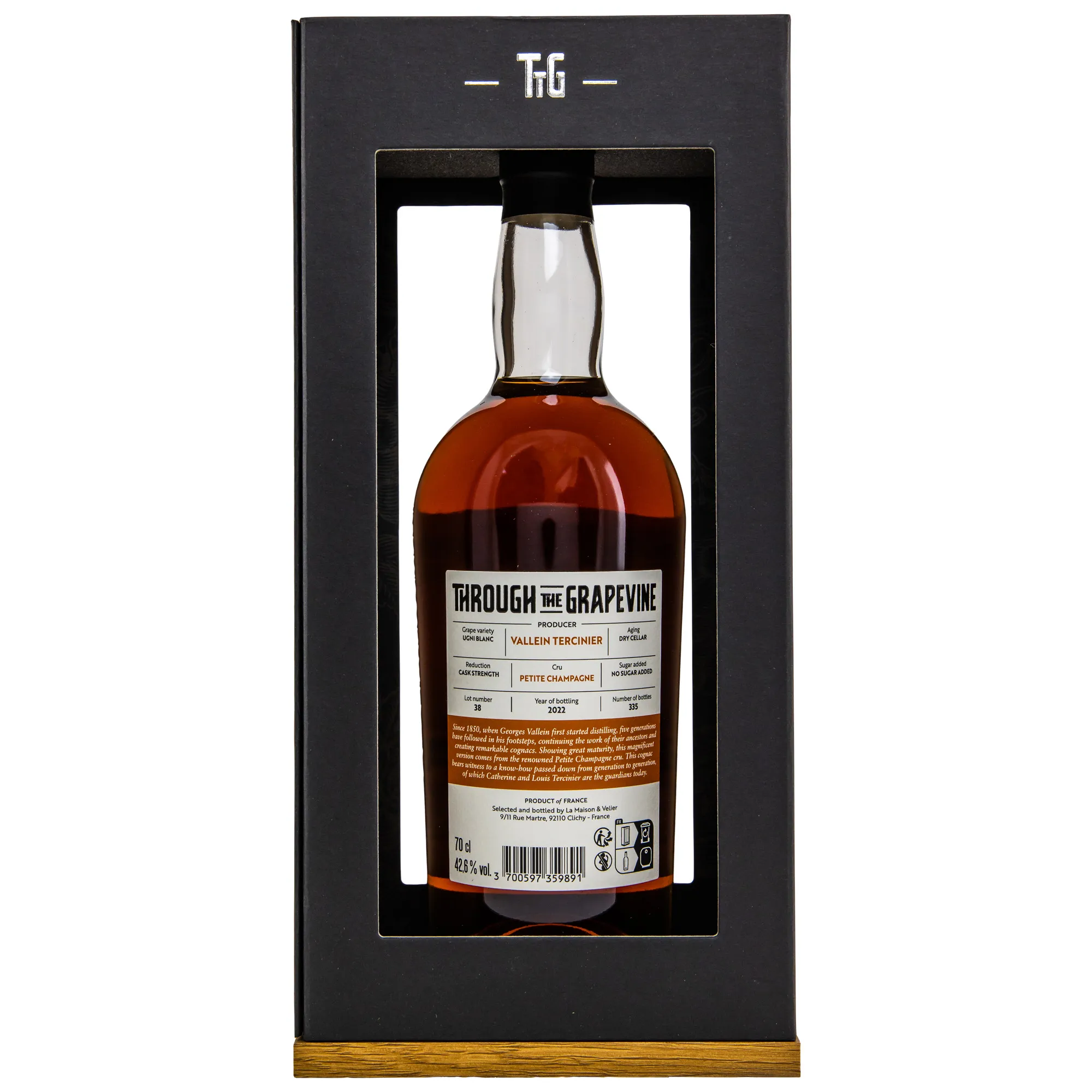 Der Vallein Tercinier Lot 38 Cognac – THROUGH THE GRAPEVINE ist das Resultat jahrelanger Hingabe und Tradition. Hergestellt im Herzen der renommierten Cognac-Region in Frankreich, vereint er einen tiefen Respekt für die Natur mit meisterlichem Können. Die Destillerie Vallein-Tercinier ist bekannt für ihre detailverliebte und sorgfältige Produktion, die sicherstellt, dass jede Flasche nicht nur ein Getränk, sondern ein Erlebnis ist.