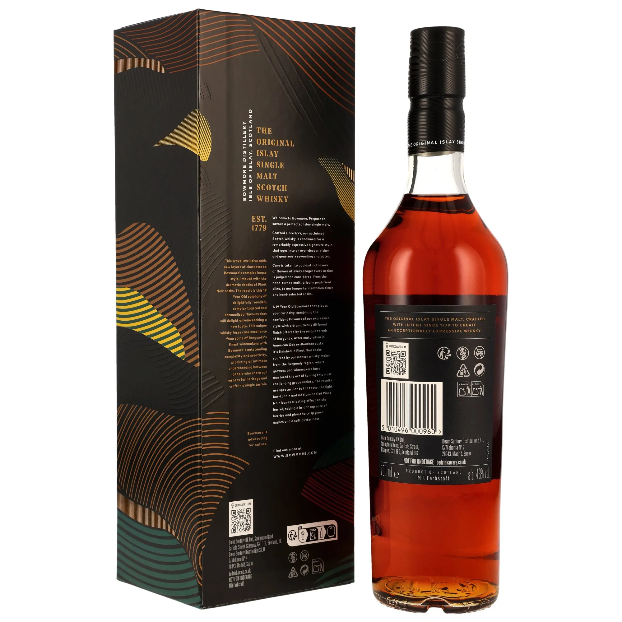 Der Bowmore 19 Jahre Pinot Noir Cask Finish ist ein herausragendes Beispiel für die Kunst des Whiskymachens. In der berühmten Bowmore-Destillerie, die bereits seit 1779 aktiv ist, wird dieser exklusive Single Malt hergestellt. Die Kombination aus jahrzehntelanger Tradition und modernen Herstellungsmethoden sorgt dafür, dass jeder Schluck dieses Whiskys ein Erlebnis für sich ist.