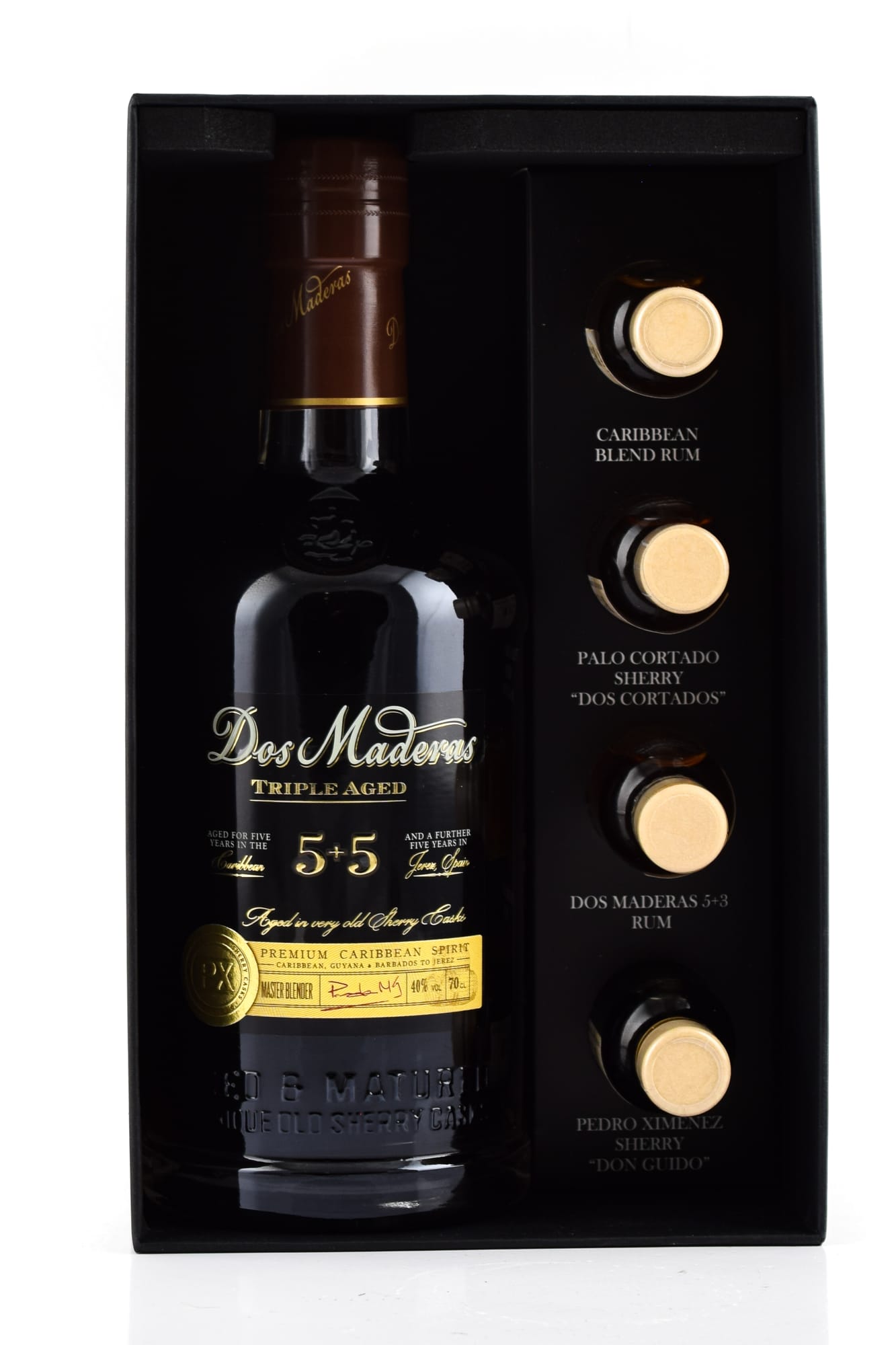 In this set you will find next to the 0,7l-bottle Dos Maderas PX 5 + 5 years Rum 40% vol. one 2.2cl bottle each of the five-year blended rum of the Barbados and Guyana rums used for this bottling, which after a second, three-year aging in Palo Cortado's exclusive Sherry "Dos Cortados", a 2.2cl bottle of sherry "Dos Cortados "as well as a bottle of Pedro Ximénez-Sherry" Don Guido of Palo Cortado, in whose barrels the 5 + 5 matures for another two years.
