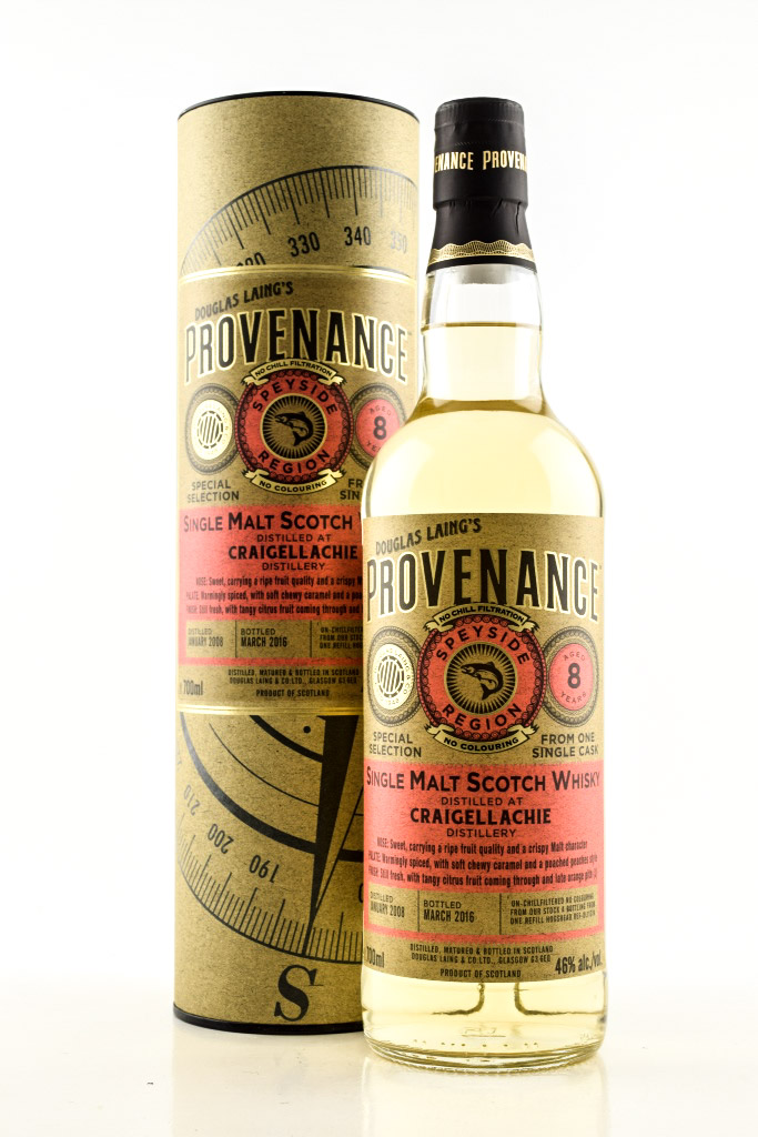 Distilled in January 2008, this single malt whiskey from Scottish Speyside distillery Craigellachie matured for over eight years on a refill hogshead before independent bottler Douglas Laing bottled the barrel in March 2016 in the Provenance series.