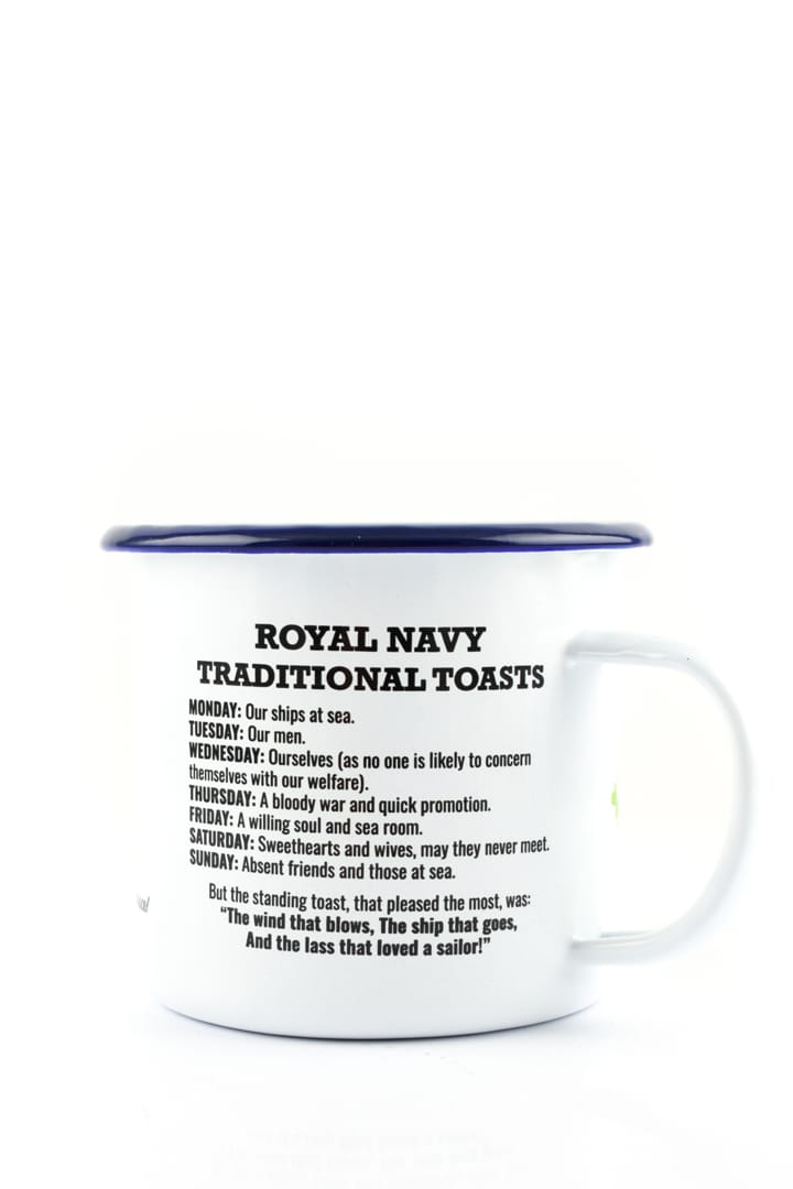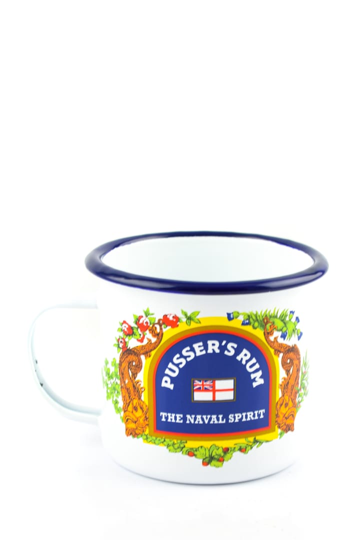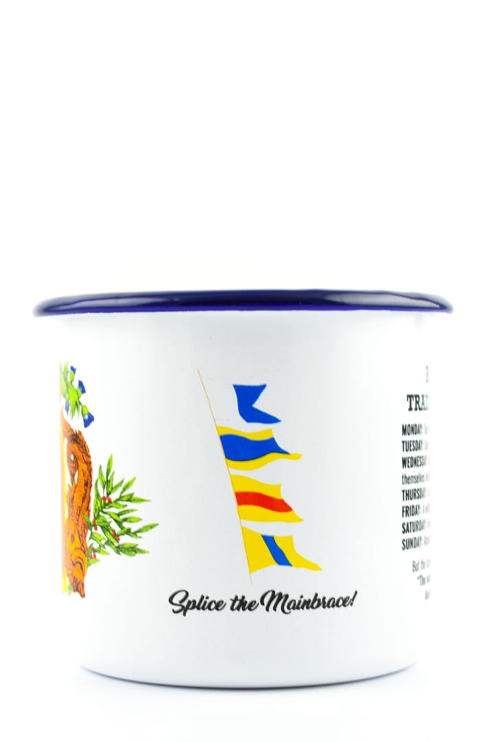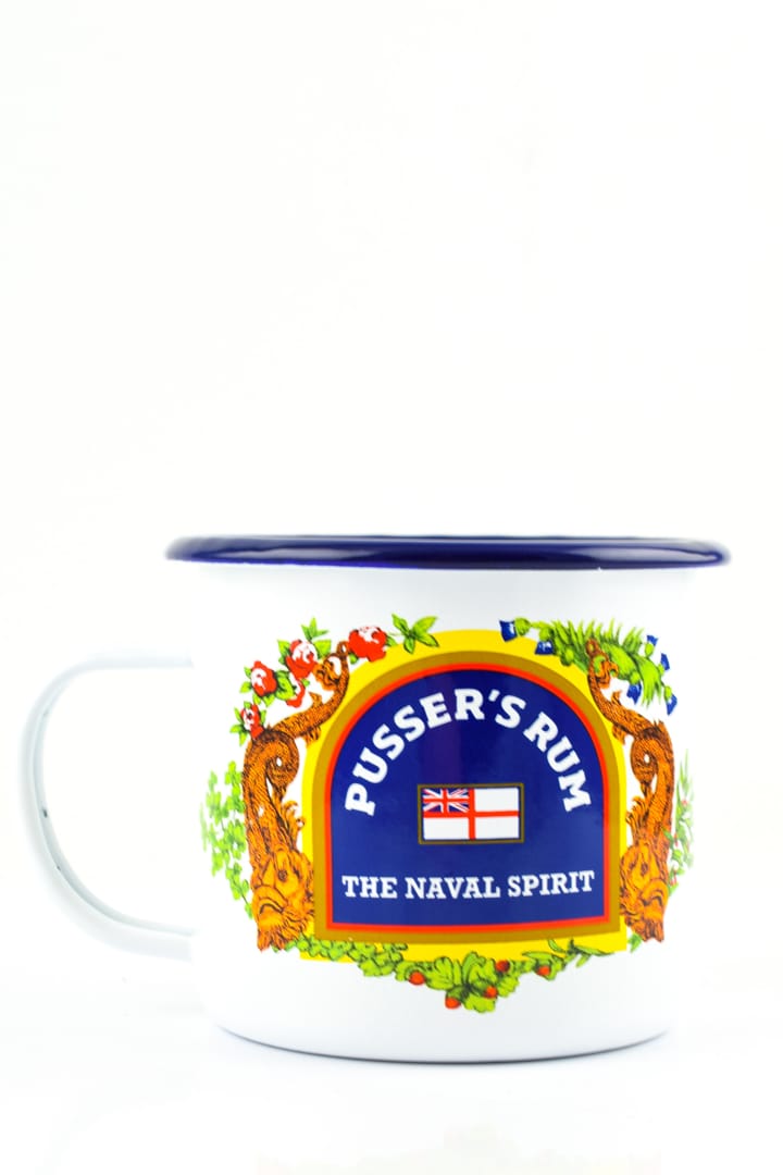 Enameled metal cup with colorful print, with the imprint of the original recipe for the cocktail "Pusser's Painkiller"