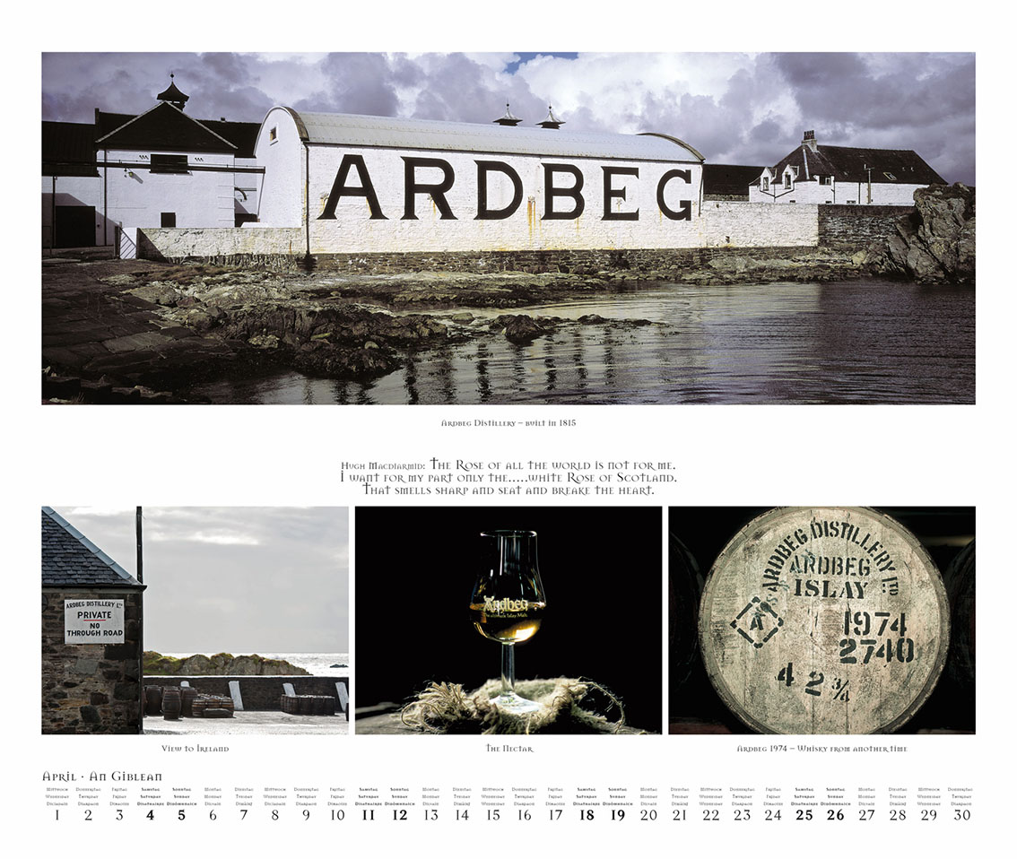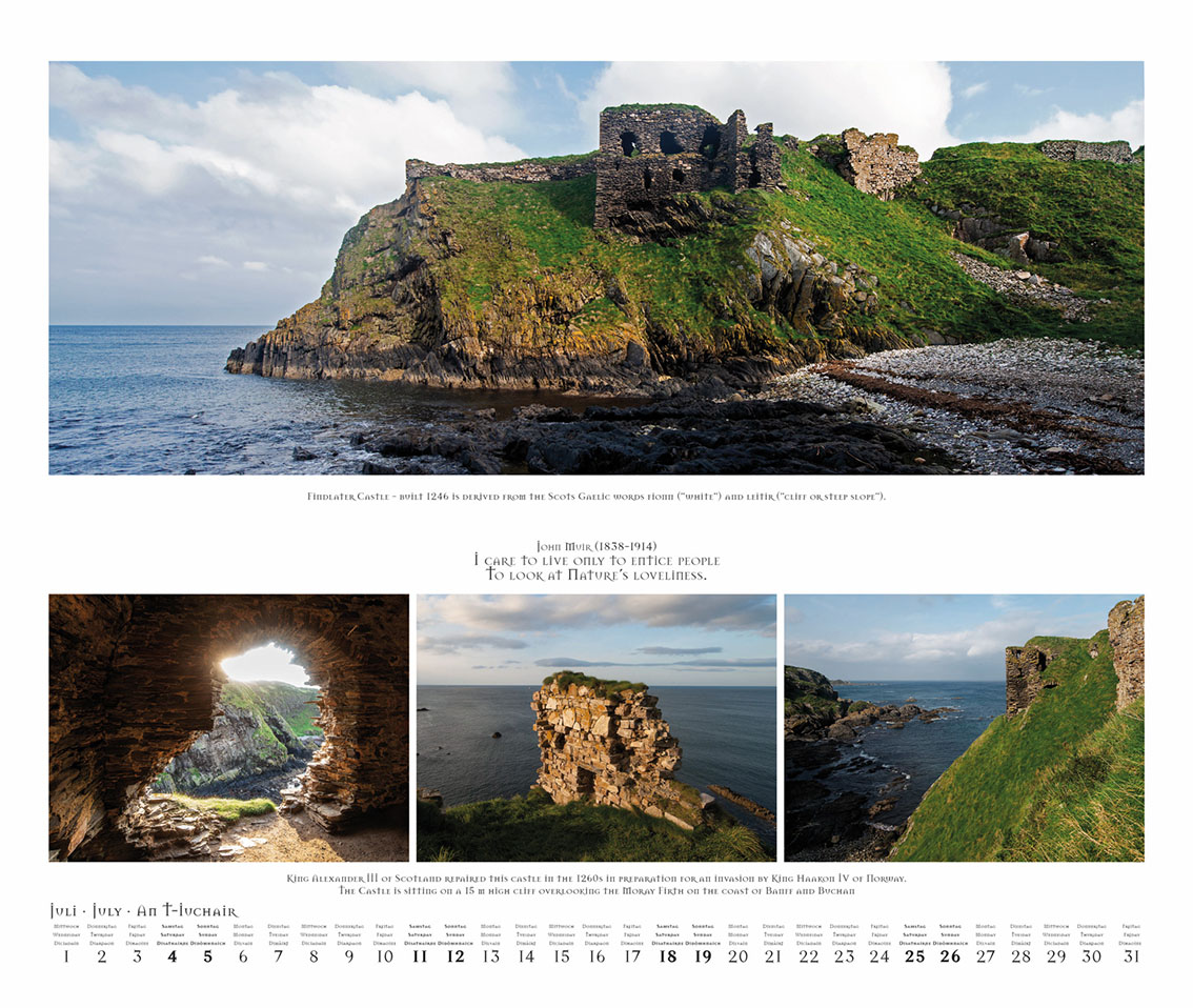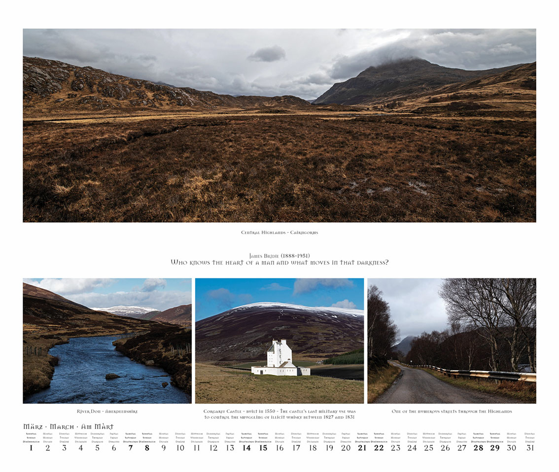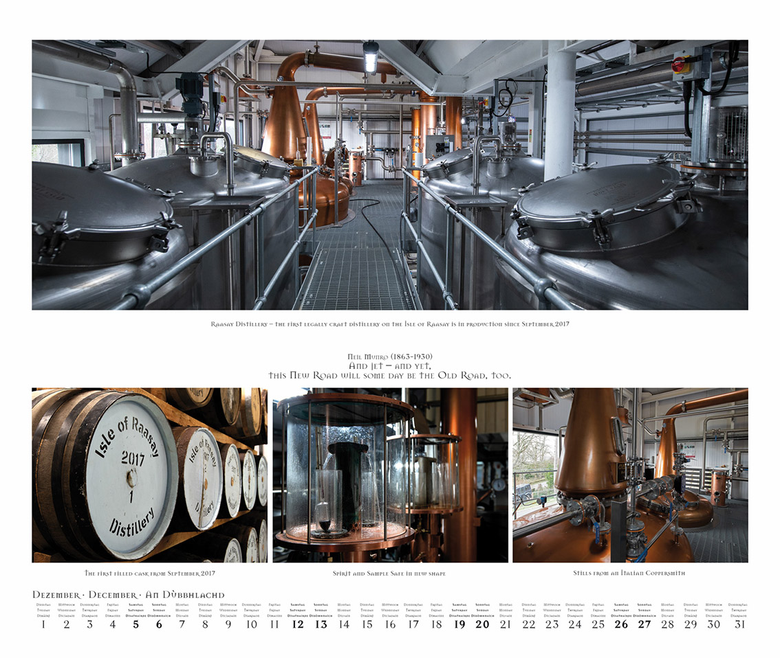 In the meantime an indispensable classic among Scotland and Whiskyliebhaber alike - the noble panoramic calendar of the German photojournalist Heinz Fesl. This year is the peculiarity of this calendar the trilingual calendar and the partially bilingual Poems (taken over from the Canongate Edinburgh) in English and Gaelic as well as the extremely high image and print quality.