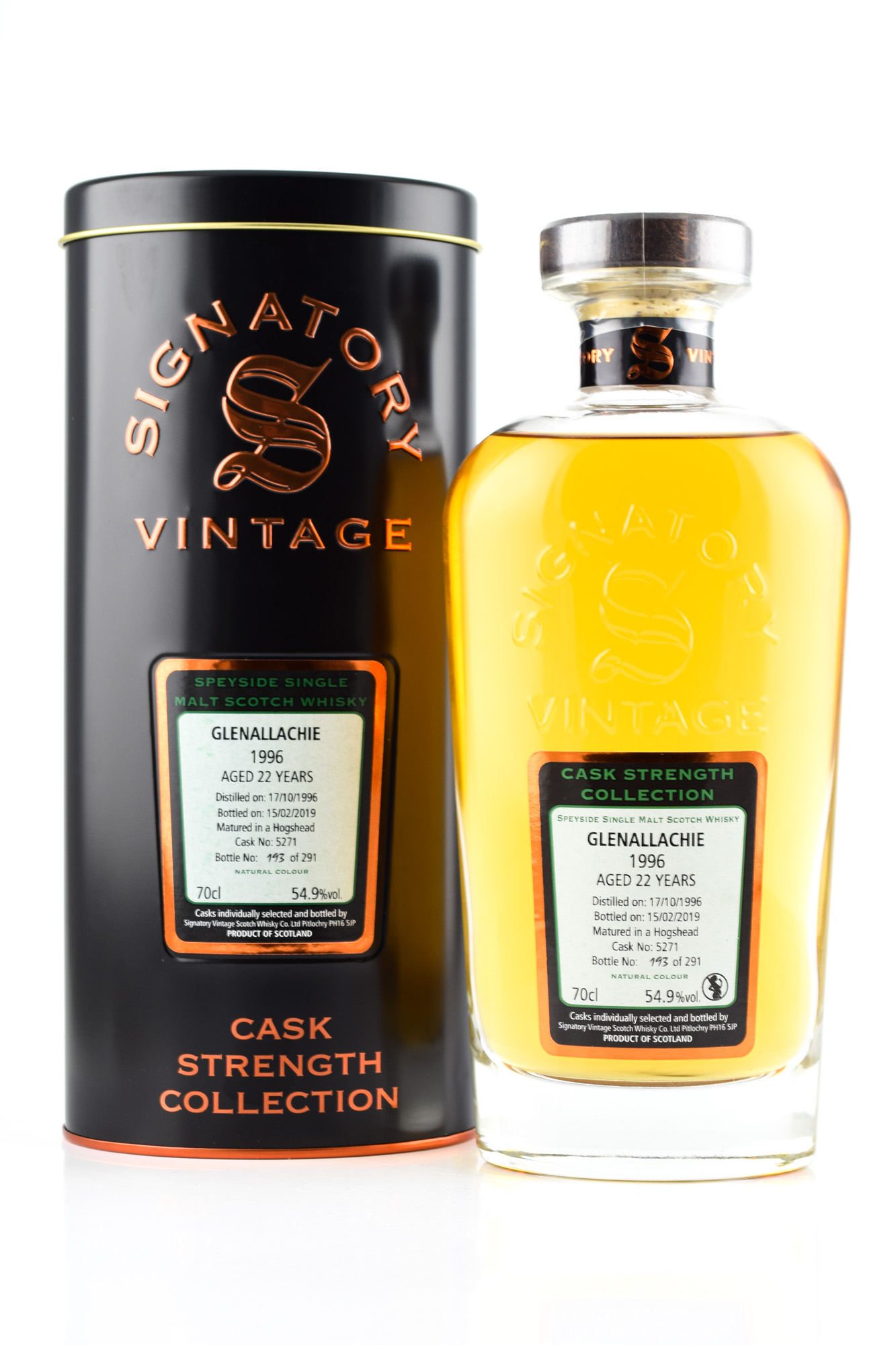 Distilled on October 17th, 1996 at GlenAllachie, Scotland's Speyside distillery, the single malt whisky was aged for over 22 years in Hogshead #5271, then independent bottler Signatory filled the cask to just 291 bottles on February 15th, 2019 in the Cask Strength Collection away.