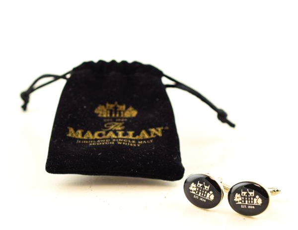 A pair of elegant cufflinks from the Scottish Speyside distillery Macallan in a velvet bag.