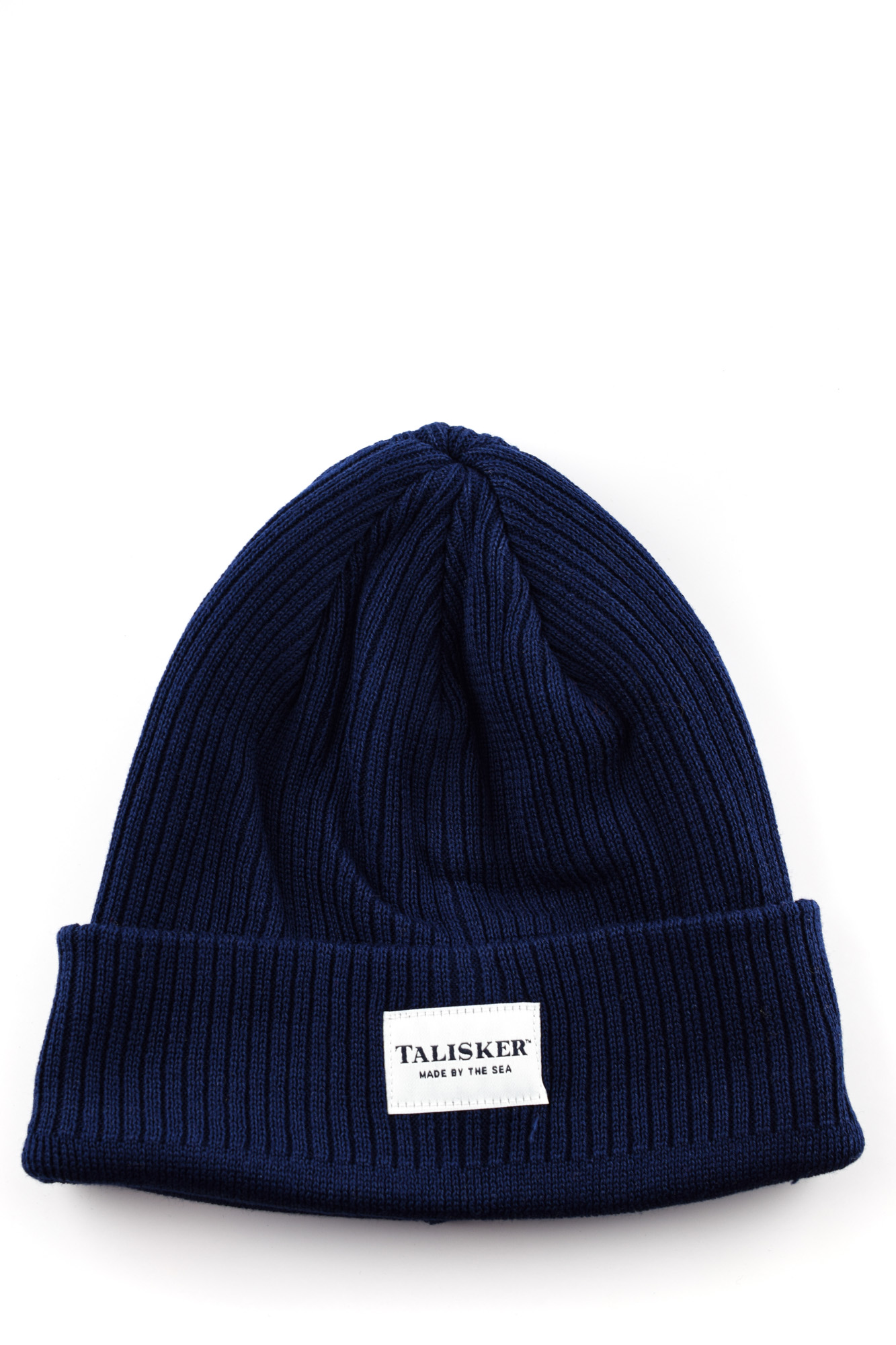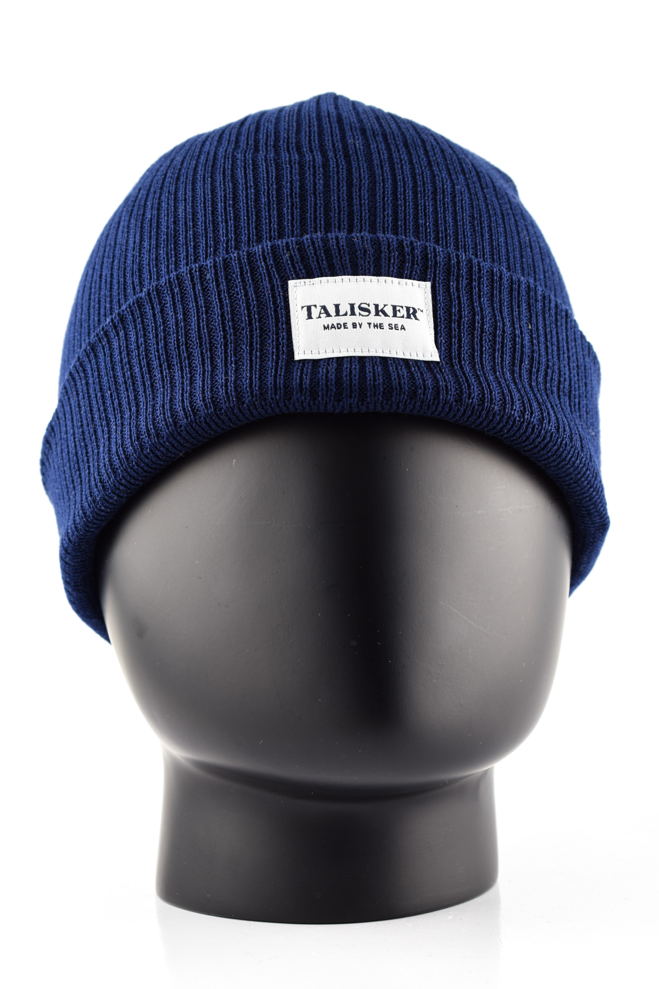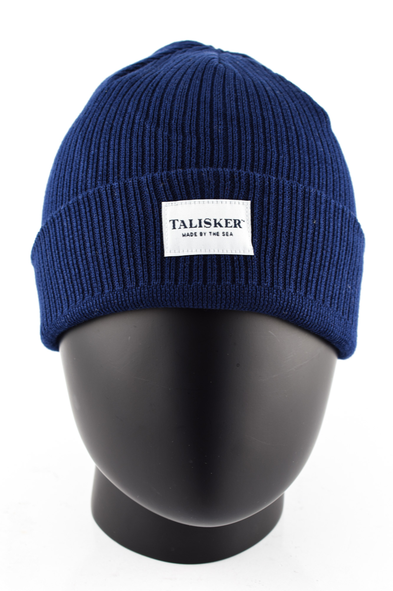 High quality knitted beanie in blue from the Scottish whisky distillery Talisker - on the front a white label with blue writing "TALISKER - Made by the Sea".