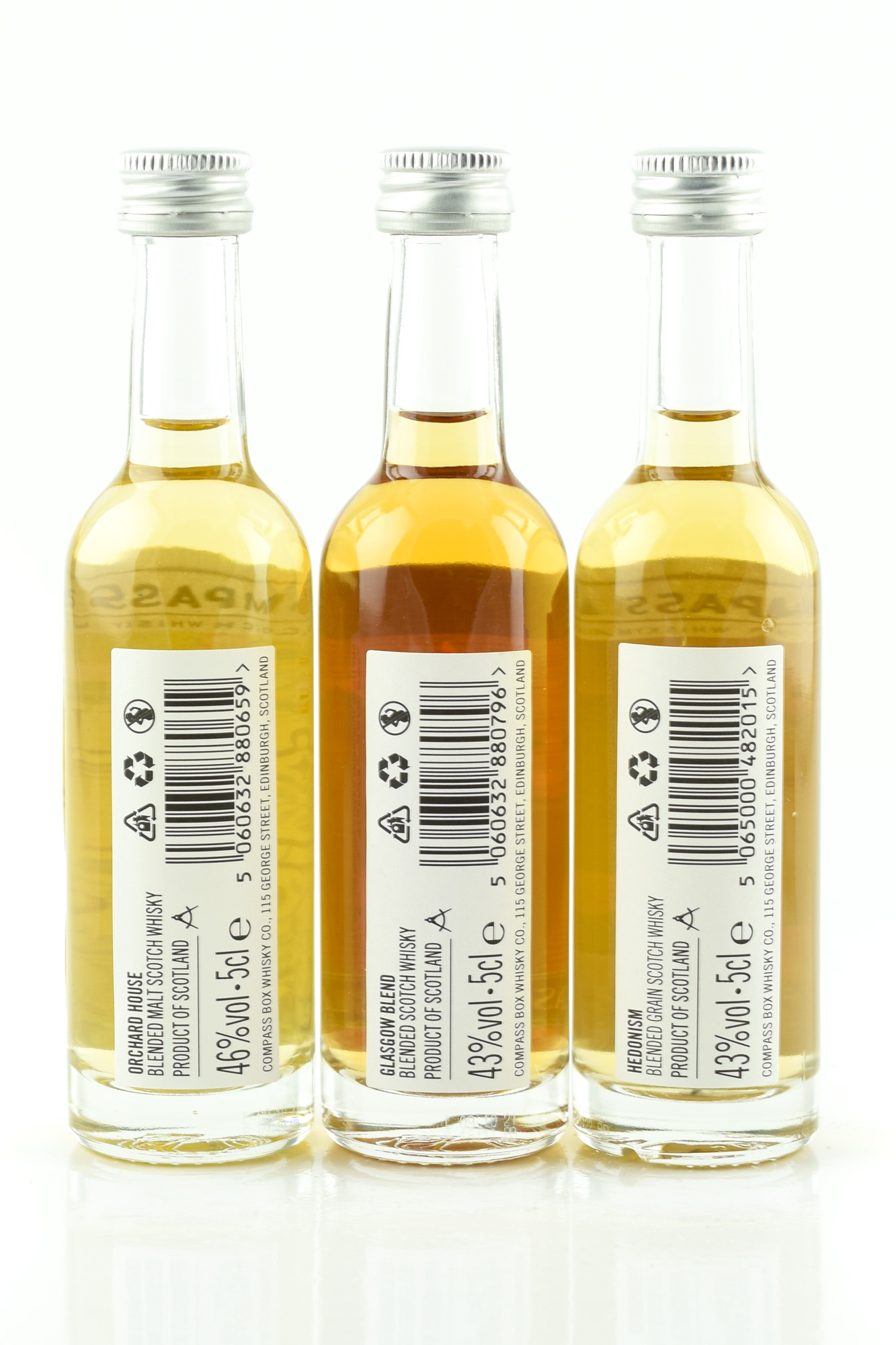 The Blenders' Collection from Compass Box. The attractive gift box contains a miniature (50ml) of the exclusive blended whiskies Glasgow Blend, Orchard House and Hedonism.
