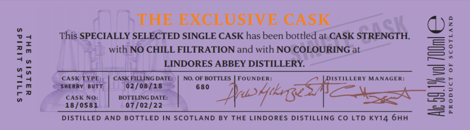The former Oloroso sherry cask #18/0581 was filled on August 2nd, 2018, the single malt whisky matured in the cask for over three and a half years, then it was bottled on February 7th, 2022 to just 680 bottles at cask strength.