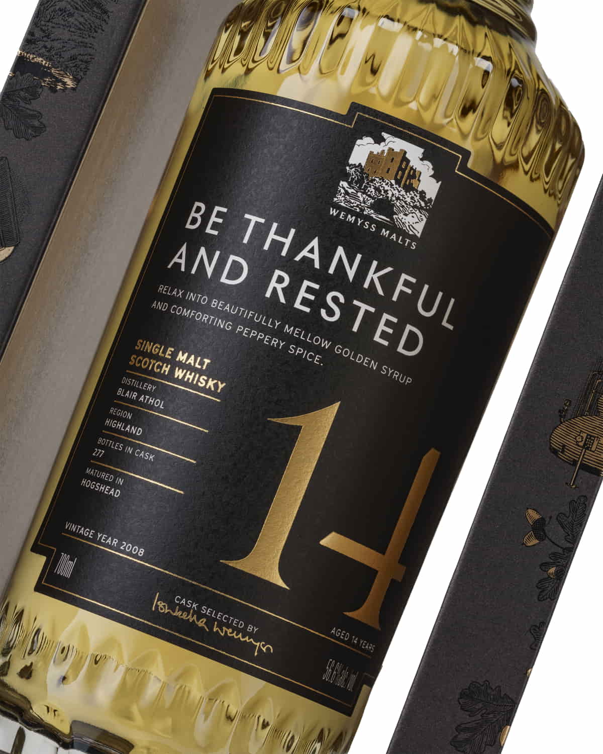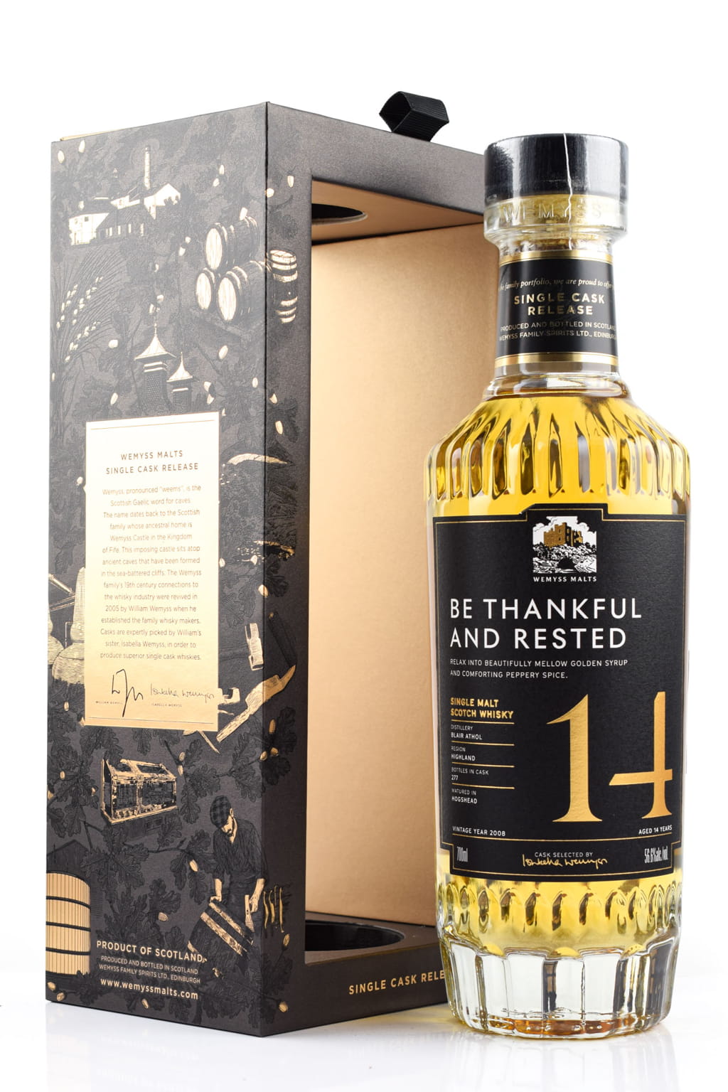 Distilled in 2008, the "Be Thankful and Rested" 14 Year Old 2008 Hogshead Blair Athol was aged in a Hogshead for over 14 years, then Wemyss filled the cask to 277 bottles in 2022.