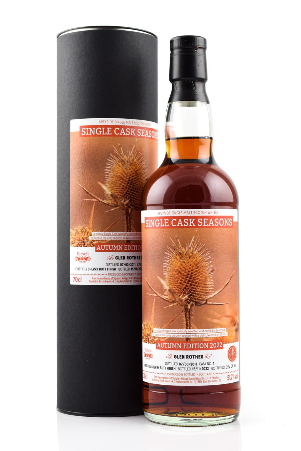 For the Seasons Autumn Edition 2022, the Glenrothes 11 Year 1st-fill Sherry Butt #1 Finish Single Cask Seasons matured in oak barrels for 11 years, including a 1st-fill exSherry Butt Finish.