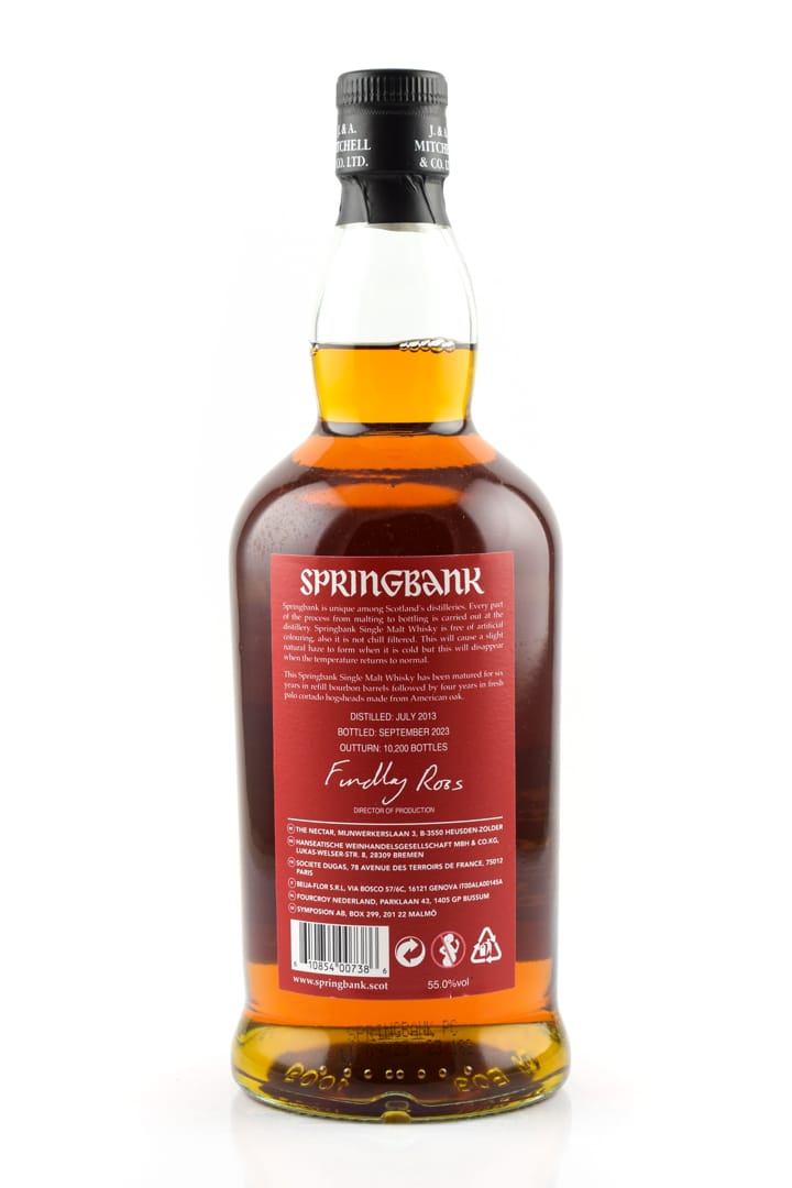 The Springbank 10 Years Palo Cortado Cask Matured first matured for six years in refilled exBourbon Barrels and then for another four years in first-filled Palo Cortado-Sherry Hogsheads.