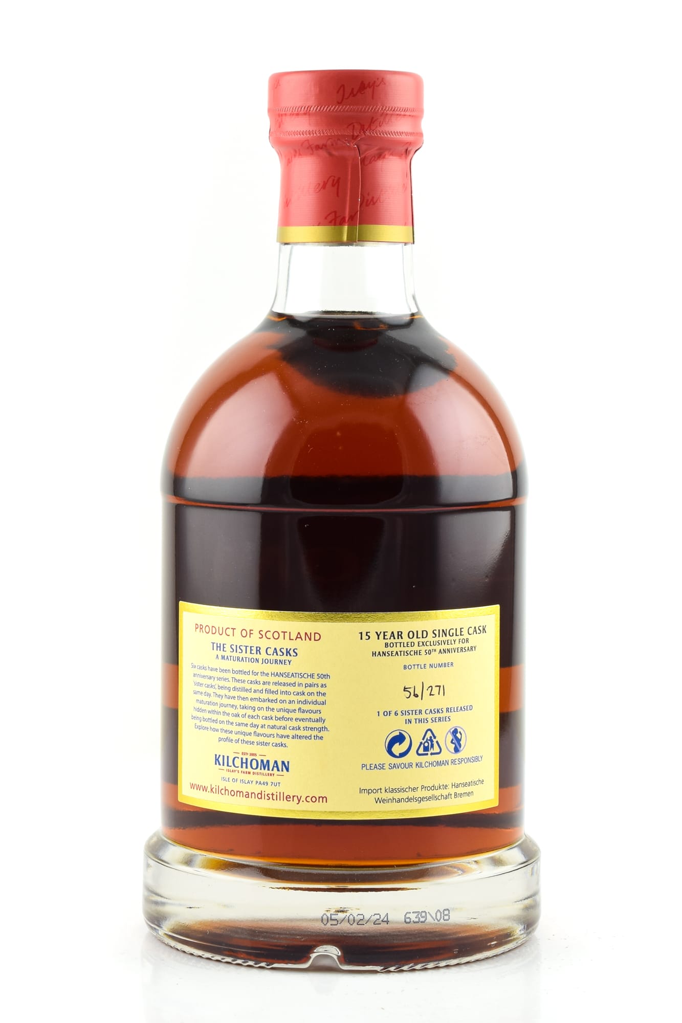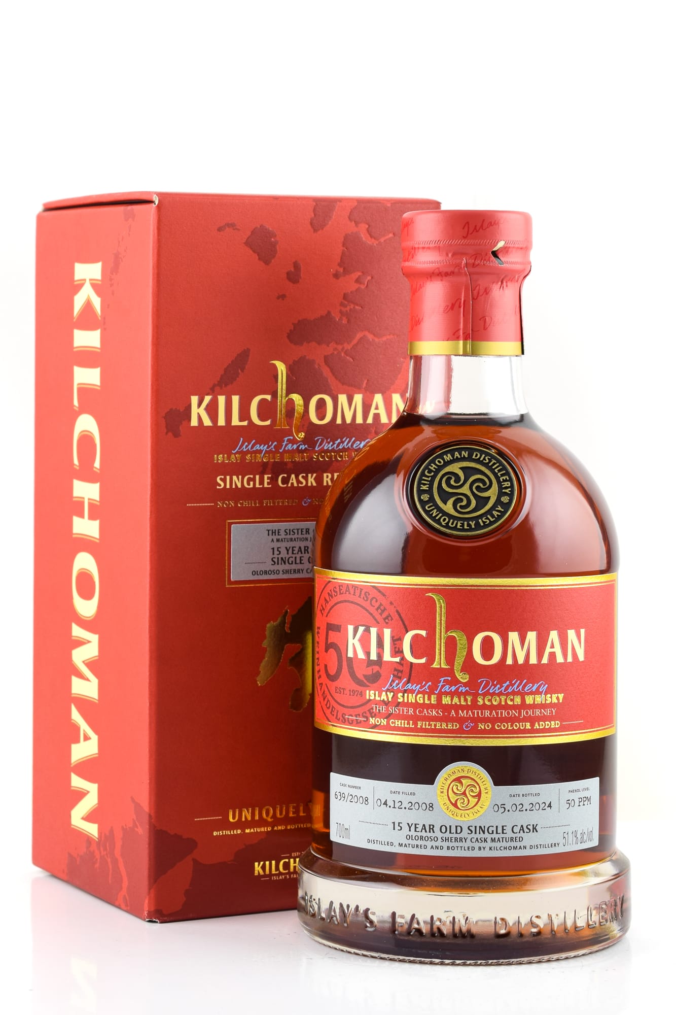 The Single Cask Kilchoman Vintage 2008 Oloroso Sherry Cask #639/2008 matured for over 15 years in a former Oloroso sherry cask and was bottled for the 50th anniversary of the Hanseatische Weinhandelsgesellschaft. Three sets of sister Casks are being released for this anniversary series, the sister Cask of this bottling is Cask #633/2008.