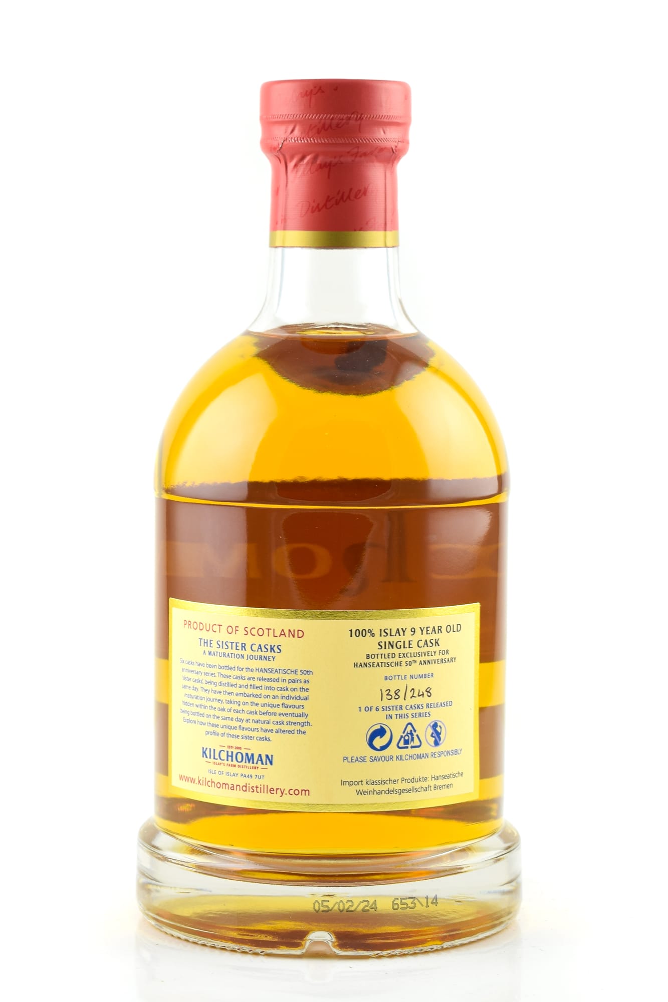 The Single Cask Kilchoman Vintage 2014 100% Islay Bourbon Cask #653/2014 matured for over 9 years in a former Bourbon Cask and was bottled for the 50th anniversary of the Hanseatische Weinhandelsgesellschaft.
