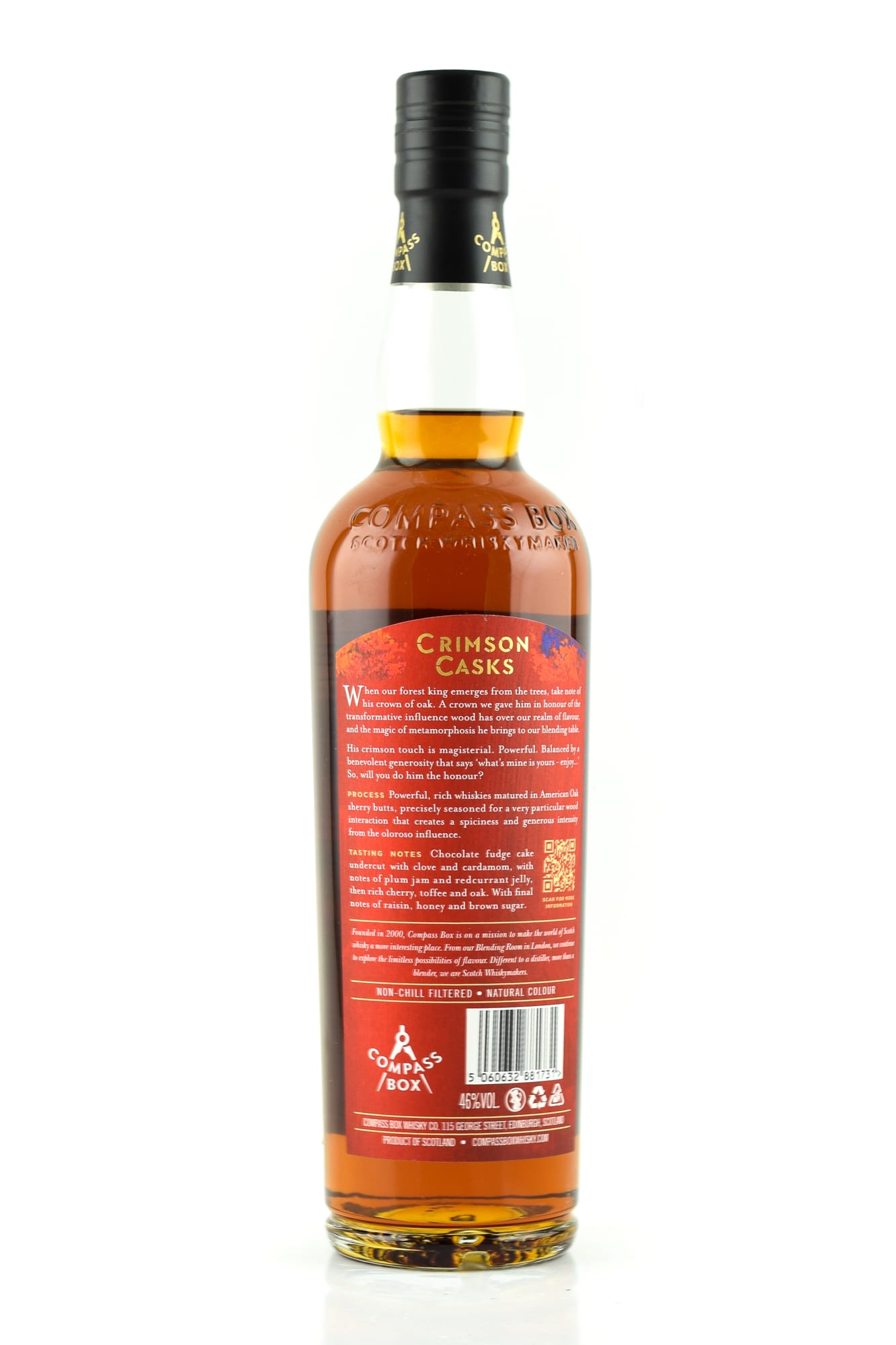 With the aromatic power of sherry casks, Compass Box rounds off Since autumn 2024, the core range has been launched with the new release Crimson Casks. The elegant blended malt Crimson Casks lets you drink Chocolate cake, baking and oak spices meld with dark, jammy fruits and garnished with raisins, honey and brown sugar. The blended malt whisky matures in casks soaked in liqueur and red wine and gives established distilleries on Speyside and Highlands new depth.