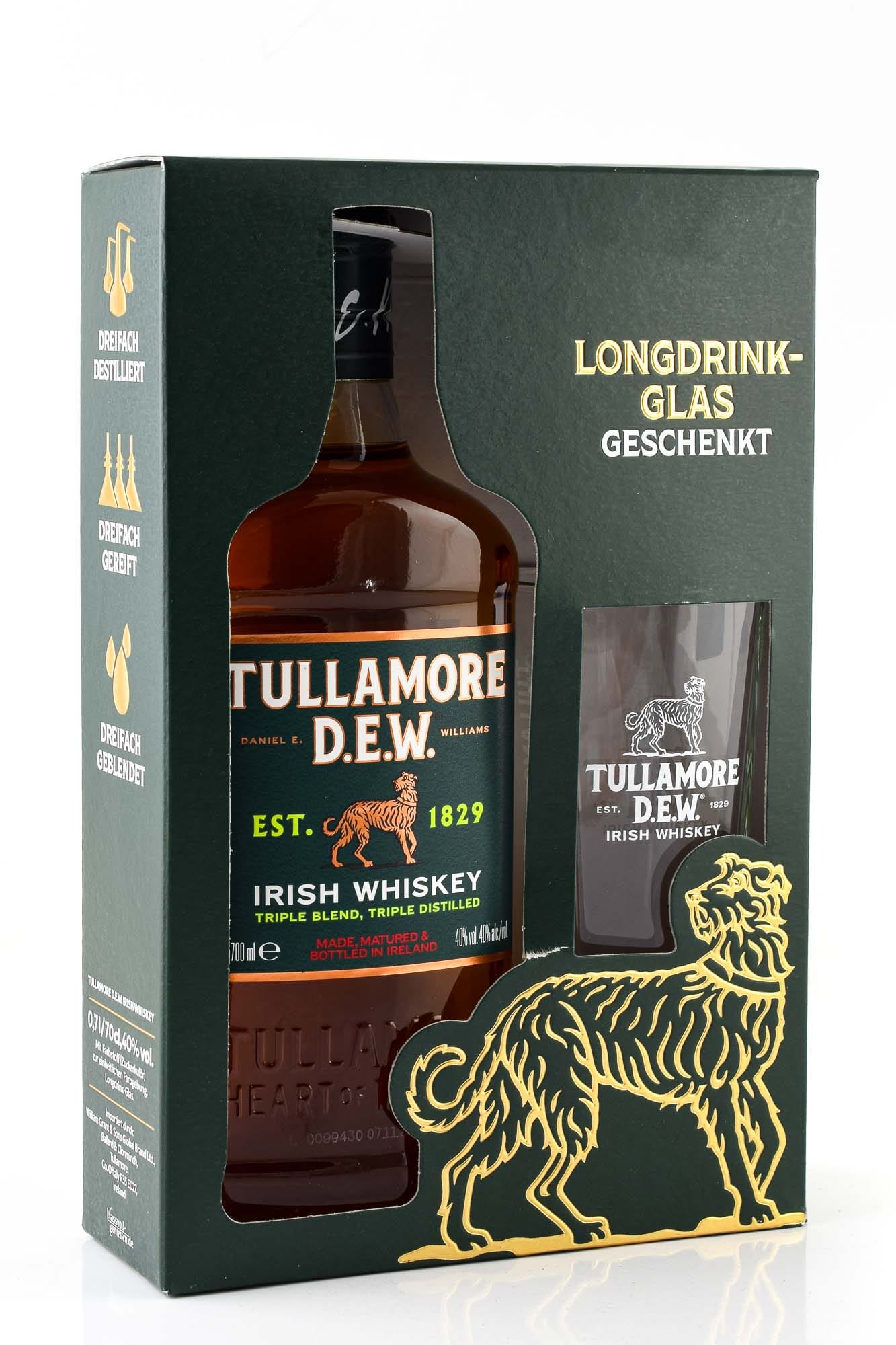 - The Irish "dewdrop" in a gift box with an original long drink glass: Triple blend, triple distilled