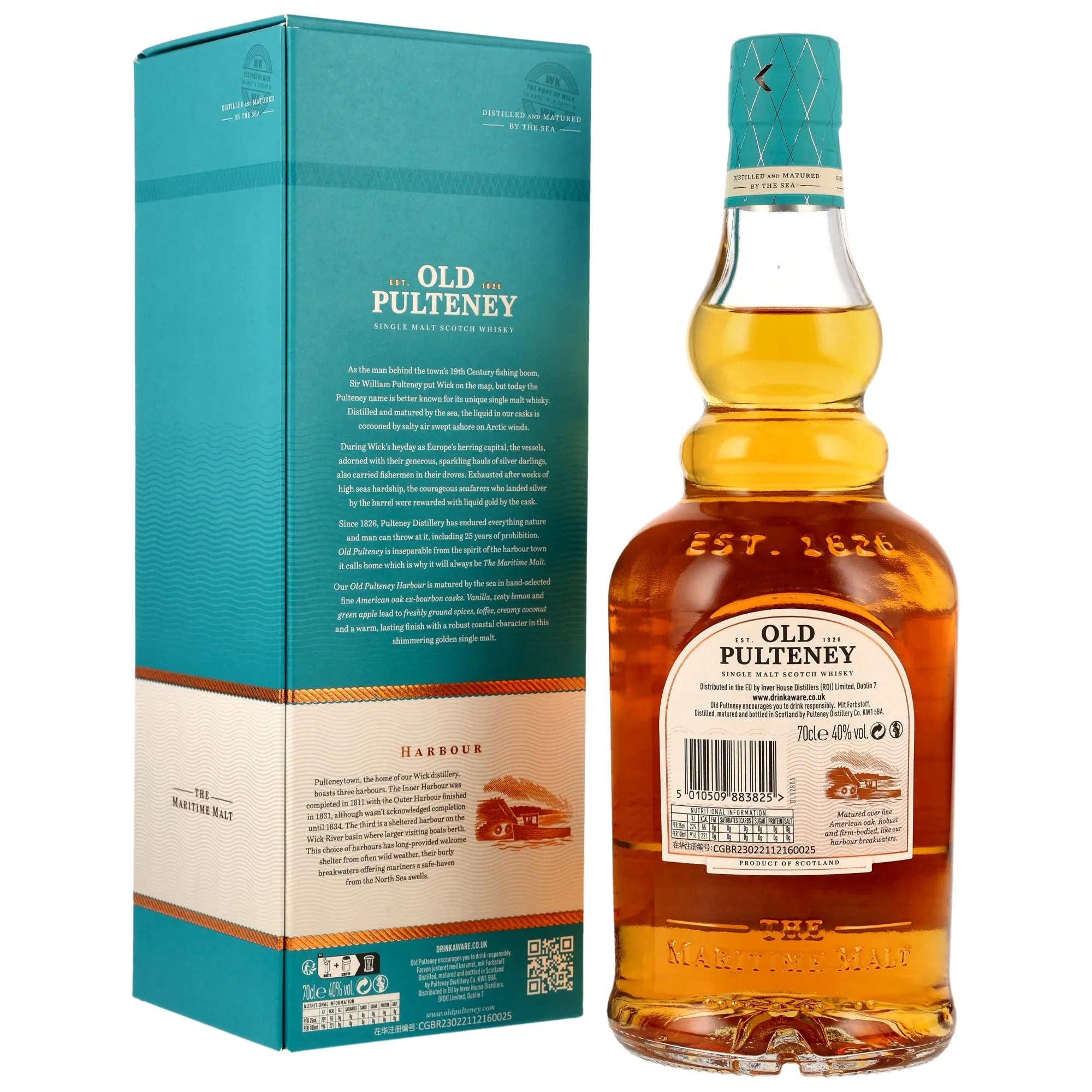 The blend of salty and sweet notes tells the story of the place and the dedication of the master distillers. With an alcohol content of 40% vol., the Old Pulteney Harbour offers an elegant drinking experience that delights both connoisseurs and newcomers alike.