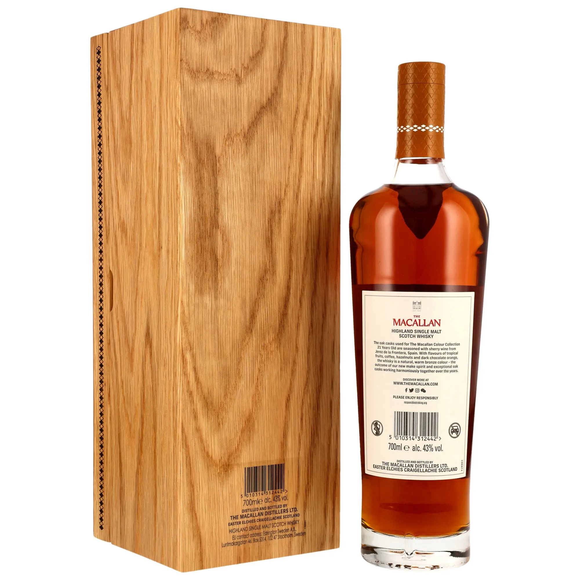 The Macallan 21 Years Colour Collection is a tribute to the tradition and craftsmanship of Scottish whisky production. Nestled in the esteemed Speyside region, the Macallan distillery is well-known for its unwavering commitment to preserving the pure flavors of whisky. With 21 years of aging in exquisite sherry casks, its unparalleled character comes to the forefront, making this whisky a true delight.