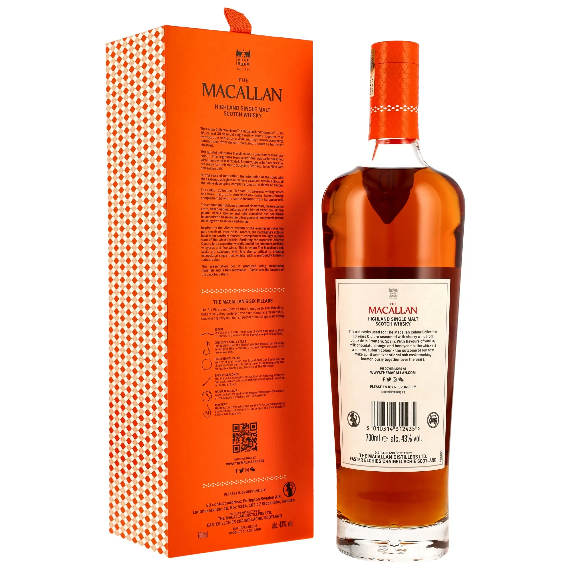 The Macallan 18 Year Colour Collection is more than just a whisky; it is a masterpiece of Scottish distilling art. Produced at the esteemed Macallan distillery in Speyside, this single malt enjoys worldwide recognition. Each drop tells a story of tradition and dedication that dates back to 1824.