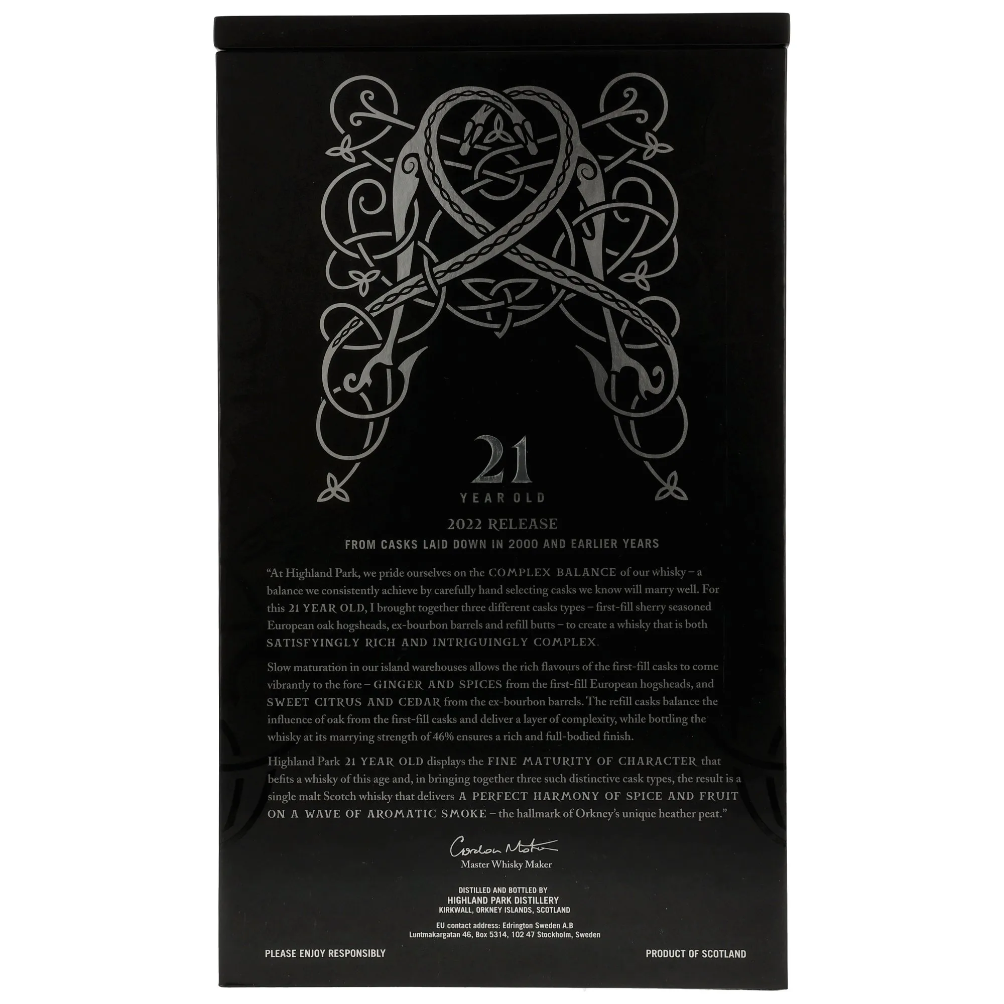 - Finish: Long and satisfying, the Highland Park 21 Year Old leaves a refreshing sweetness with a light peaty aftertaste.