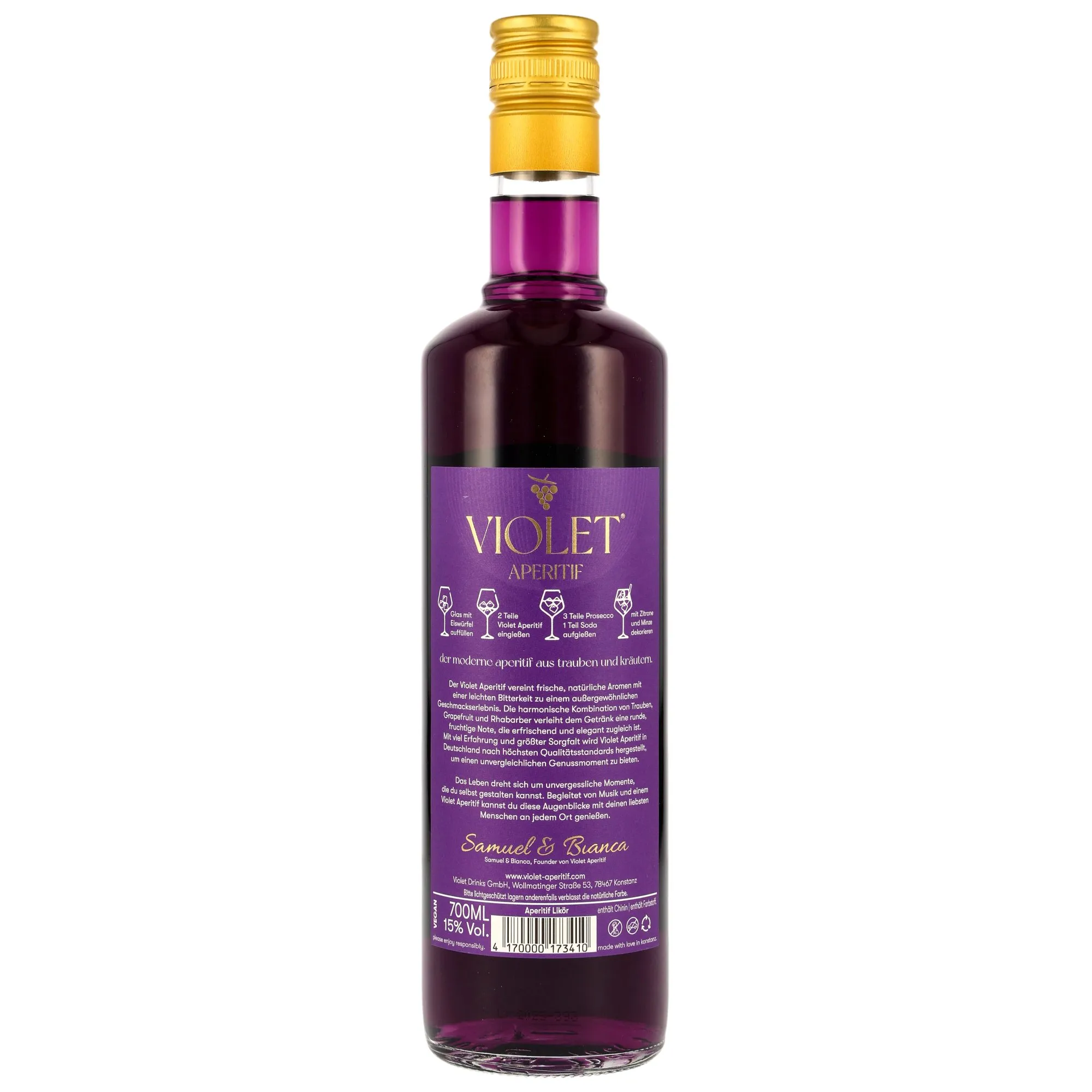 The Violet Aperitif is the result of a passionate dedication to the art of distillation. With an alcohol content of 15% vol., it's the perfect choice for creative cocktails or as a refreshing aperitif. Each sip tells the story of carefully selected ingredients crafted into a liquid masterpiece in the beautiful city of Constance.