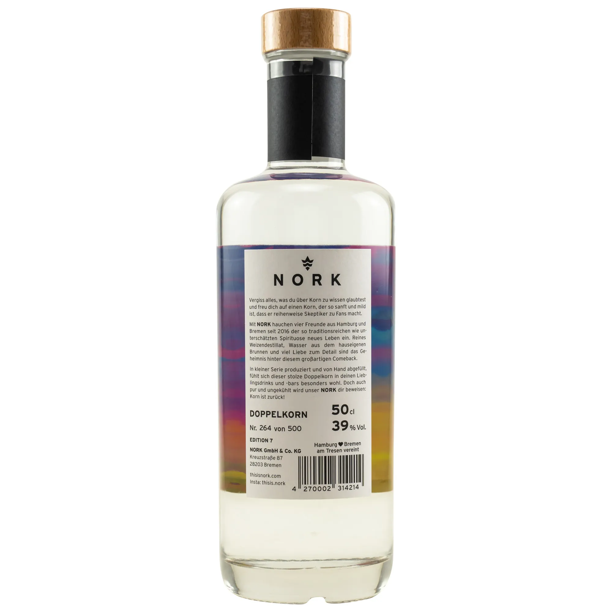 The Nork Original is an outstanding example of German Korn, produced in the historic city of Bremen. Here, craftsmanship meets modern spirits design to create a product that shines both neat and in mixed drinks.